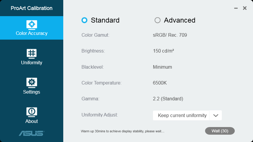 С монитором может работать фирменная программа Asus ProArt Calibration, с помощью которой можно аппаратно (с правкой внутренних таблиц монитора) откалибровать монитор и подправить равномерность яркости и цветового баланса по площади.