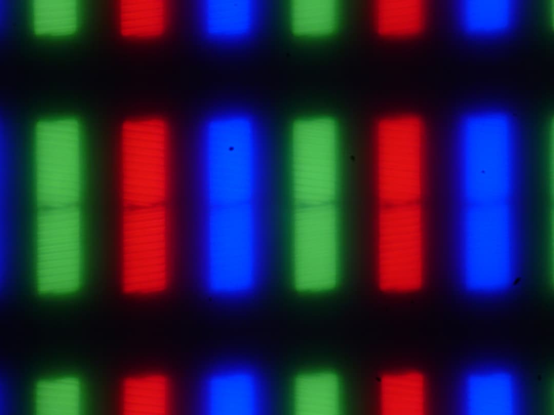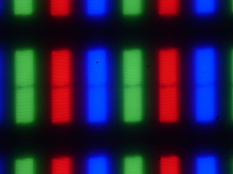 Четкое изображение структуры пикселей из-за матовой поверхности получить не удается, впрочем, при желании на фрагменте ниже можно разглядеть типичную для IPS структуру в виде параллельных полосок, а также, что каждый субпиксель делится на два примерно равных домена (черные точки — это пыль на матрице фотоаппарата):