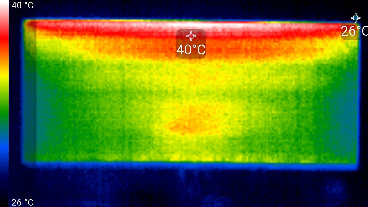 Спереди в верхней части экрана была зафиксирована температура в 40 °C — видимо, там находится светодиодная линейка подсветки экрана. Сзади нагрев незначительный.
