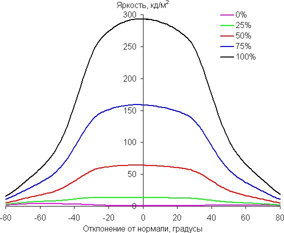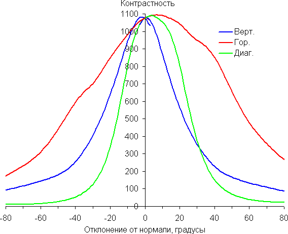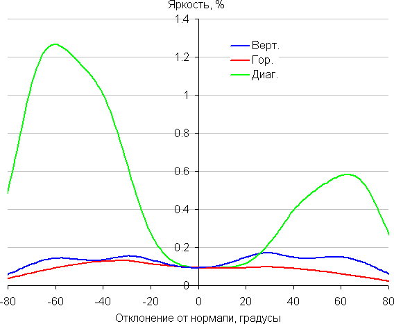 Отметим плавное уменьшение яркости при отклонении от перпендикуляра к экрану в горизонтальном направлении, при этом графики не пересекаются во всем диапазоне измеряемых углов. По горизонтальным углам обзора результат очень хороший. Чуть быстрее падает яркость при отклонении в вертикальном направлении. При отклонении в диагональном направлении поведение яркости оттенков имеет промежуточный характер между вертикальным и горизонтальным направлениями, за исключением яркости черного поля, которая начинает резко возрастать уже при 20°-30° отклонения от перпендикуляра к экрану. Если сидеть от экрана на расстоянии 50-60 см, то черное поле по углам будет заметно светлее, чем в центре. Контрастность в диапазоне углов ±82° в случае отклонения по диагонали приближается к отметке 10:1 и опускается ниже при отклонении в одном направлении более чем на 73°.