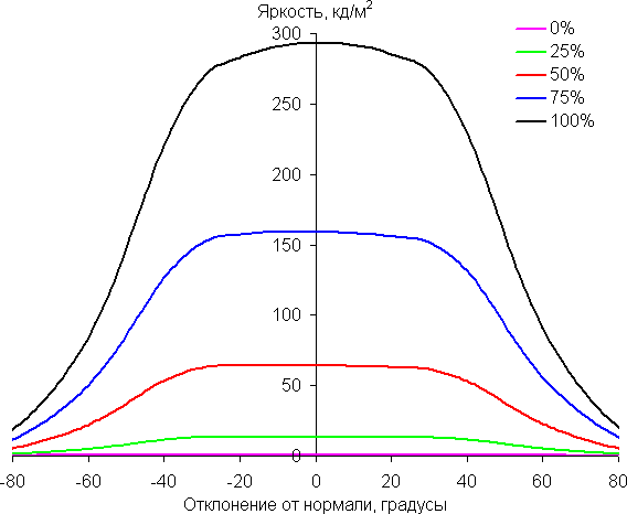 В качестве реперной точки можно выбрать отклонение в 45°, что может быть актуальным в случае, например, если изображение на экране рассматривают два человека одновременно. Критерием сохранения правильности цветов можно считать значение ΔE меньше 3. Стабильность цветов очень хорошая, это является одним из главных достоинств матрицы типа IPS.
