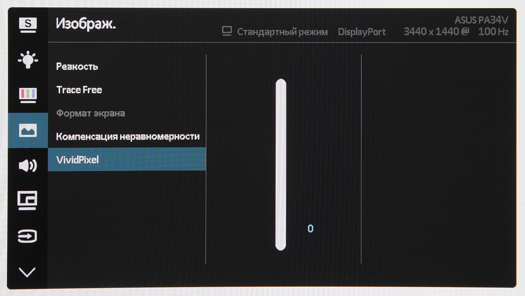 VividPixel — функция продвинутого масштабирования к разрешению матрицы. Есть и режим Компенсация неравномерности, при выборе которого должна уменьшаться неравномерность яркости и цветового тона по площади экрана.