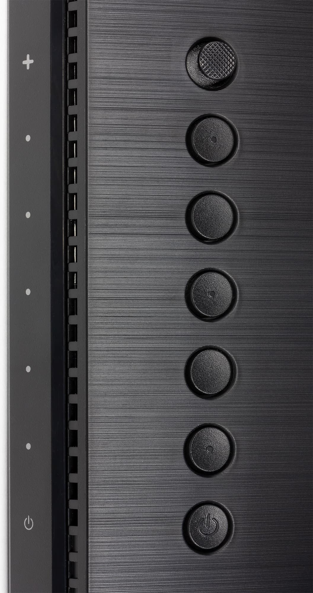 В правой нижней части задней панели очень близко к правому торцу вертикально в ряд расположены 5-позиционный джойстик и еще шесть механических кнопок управления. Различать кнопки на ощупь помогают выпуклые точки на трех кнопках и выпуклый значок питания на соответствующей кнопке. На боковой грани окантовки напротив кнопок нанесены неконтрастные значки.