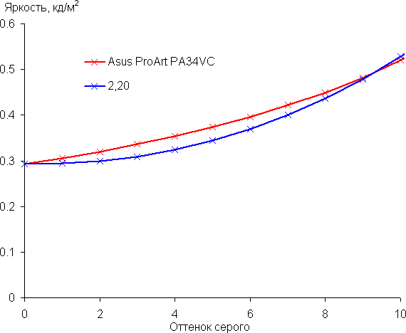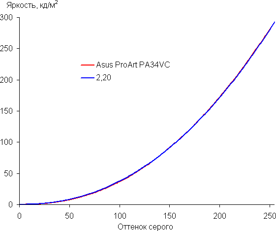 Аппроксимация полученной гамма-кривой дала показатель 2,20, что в точности равно стандартному значению 2,2, при этом реальная гамма-кривая очень мало отклоняется от аппроксимирующей степенной функции: