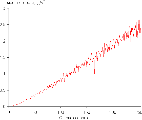 Реальная гамма-кривая ближе всего к стандартной при выборе Гамма = 2,2, поэтому далее мы измерили яркость 256 оттенков серого (от 0, 0, 0 до 255, 255, 255) при этом значении. График ниже показывает прирост (не абсолютное значение!) яркости между соседними полутонами: