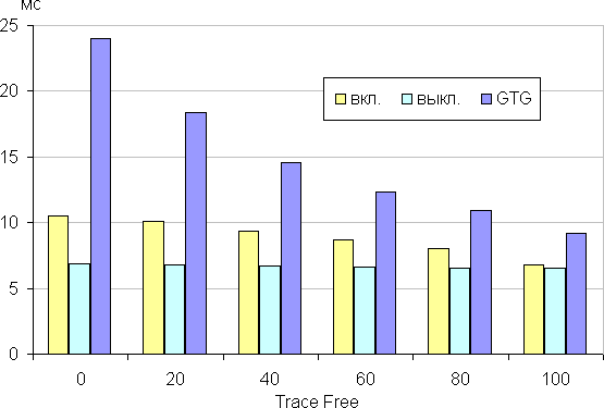 Время отклика зависит от значения настройки Trace Free, которая управляет разгоном матрицы. При 0 разгона нет, при 100 разгон максимальный (шаг регулировки равен 20). График ниже показывает, как меняется время включения и выключения при переходе черный-белый-черный (столбики вкл. и выкл.), а также среднее суммарное время для переходов между полутонами (столбики GTG):