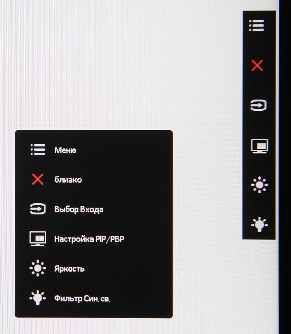 Индикатор состояния неяркий. Он светится белым при работе монитора, оранжевым в режиме ожидания и не горит, когда монитор выключен. Спереди индикатор практически не видно. Подсветку индикатора в рабочем состоянии можно отключить в меню. Навигация по меню удобная, чему в частности способствуют значки-подсказки точно напротив кнопок, зацикленные списки и удобный джойстик. Если монитор работает и на экране нет меню, то при первом нажатии на джойстик, или на любую кнопку (кроме кнопки питания), или при отклонении джойстика выводится короткое меню из значков напротив кнопок и окошком с описанием функций.