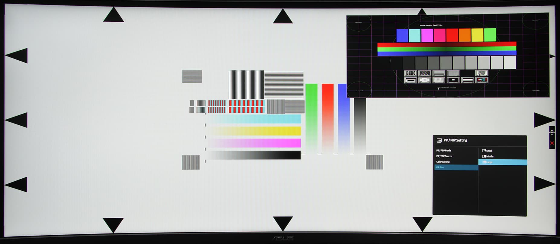 Присутствует функция двойного изображения картинка-в-картинке (PIP) и картинка-рядом-с-картинкой (PBP). В режиме PIP выбирается положение дополнительного окна в одном из четырех углов, а также его размер из трех возможных (но ни в одном мы не получили вывод пиксель в пиксель для дополнительного окна).