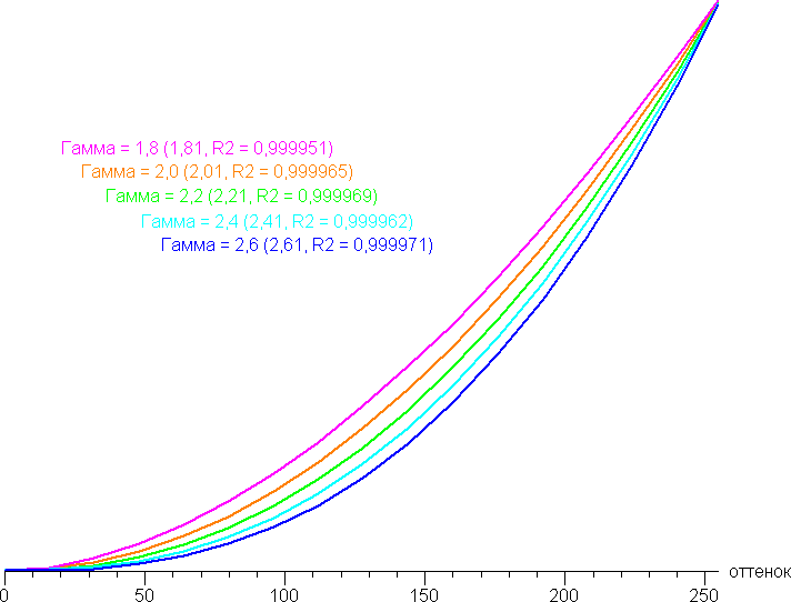 Реальная гамма-кривая зависит от выбранного профиля в списке Гамма (значения показателей аппроксимирующей функции приведены в скобках в подписях, там же — коэффициент детерминации):