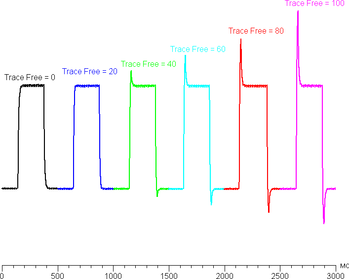 При значениях Trace Free выше 0 на графиках некоторых переходов появляются характерные всплески яркости, например, так выглядят графики для перехода между оттенками 40% и 60% (значения Trace Free приведены над графиками; по вертикали — яркость, по горизонтали — время, для наглядности графики выстроены последовательно):