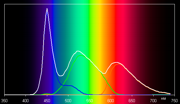 Такой спектр с относительно узким пиком синего и с широкими горбами зеленого и красного цветов характерен для мониторов, в которых используется светодиодная подсветка с синим излучателем и желтым люминофором.