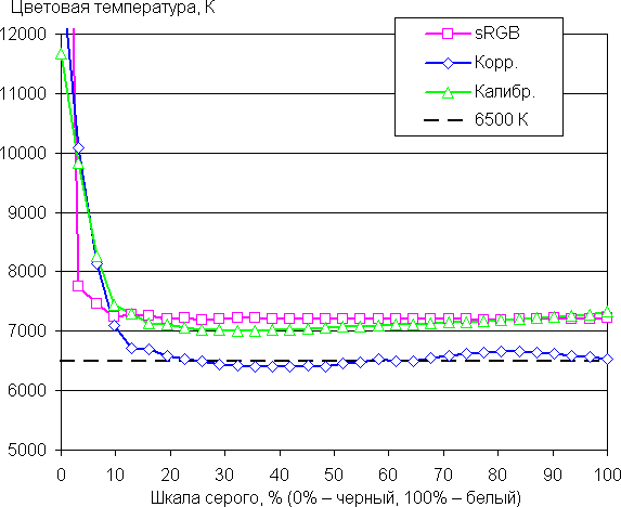 Цветопередача при выборе, например, профиля sRGB удовлетворит не очень требовательного пользователя. Мы попытались вручную скорректировать цветовой баланс, регулируя усиление трех основных цветов. Дополнительно мы выполнили аппаратную калибровку с помощью ПО Asus ProArt Calibration (целевой охват — sRGB, а цветовая температура — 6500 К, яркость — 300 кд/м²). Графики ниже показывают цветовую температуру на различных участках шкалы серого и отклонение от спектра абсолютно черного тела (параметр ΔE) без вмешательства (sRGB), после ручной коррекции (Корр.) и после калибровки (Калибр.):