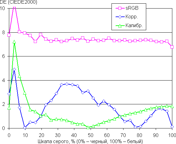 Самый близкий к черному диапазон можно не учитывать, так как в нем цветопередача не так важна, а погрешность измерения цветовых характеристик высокая. Лучшим по равномерности параметров оказался встроенный профиль sRGB. Ручная коррекция приблизила цветовую температуру к стандартным 6500 К, на белом поле снизила ΔE, но увеличила разброс этого параметра. Аппаратная калибровка дала некоторый компромиссный вариант, но, пожалуй, лучший из всех трех.