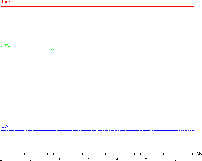 Яркость монитора меняется именно яркостью подсветки, то есть без ущерба для качества изображения (сохраняется контрастность и количество различимых градаций) яркость монитора можно менять в достаточно широких пределах, что позволяет с комфортом работать и смотреть фильмы как в освещенном, так и в темном помещении. На любом уровне яркости мало-мальски значимая модуляция подсветки отсутствует, что исключает видимое мерцание экрана. В доказательство приведем графики зависимости яркости (вертикальная ось) от времени (горизонтальная ось) при различных значениях настройки яркости: