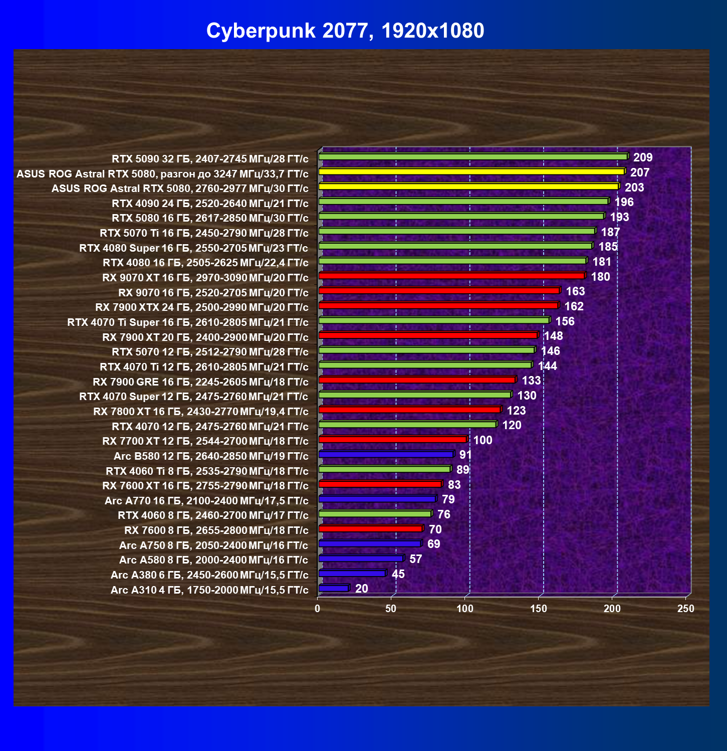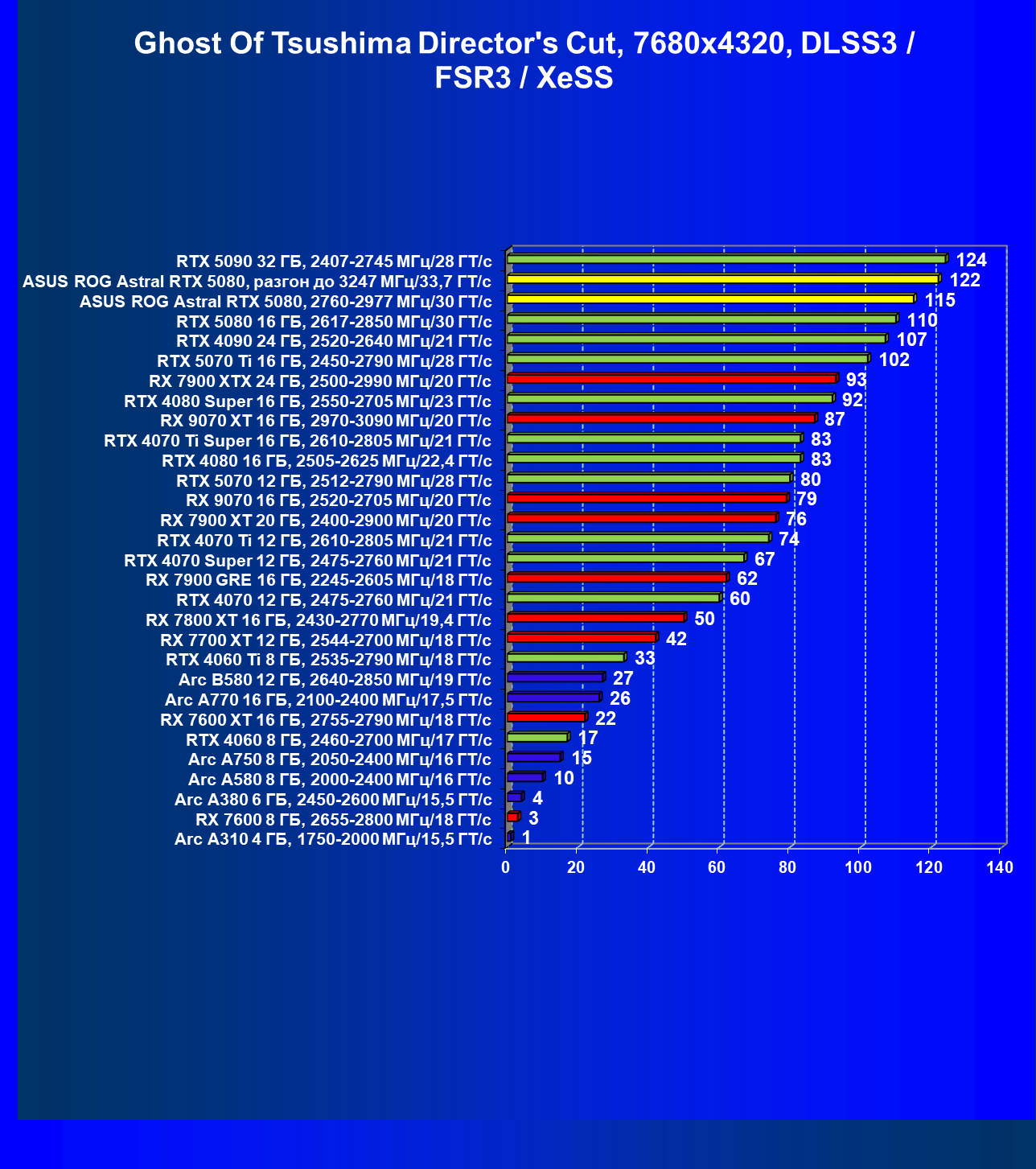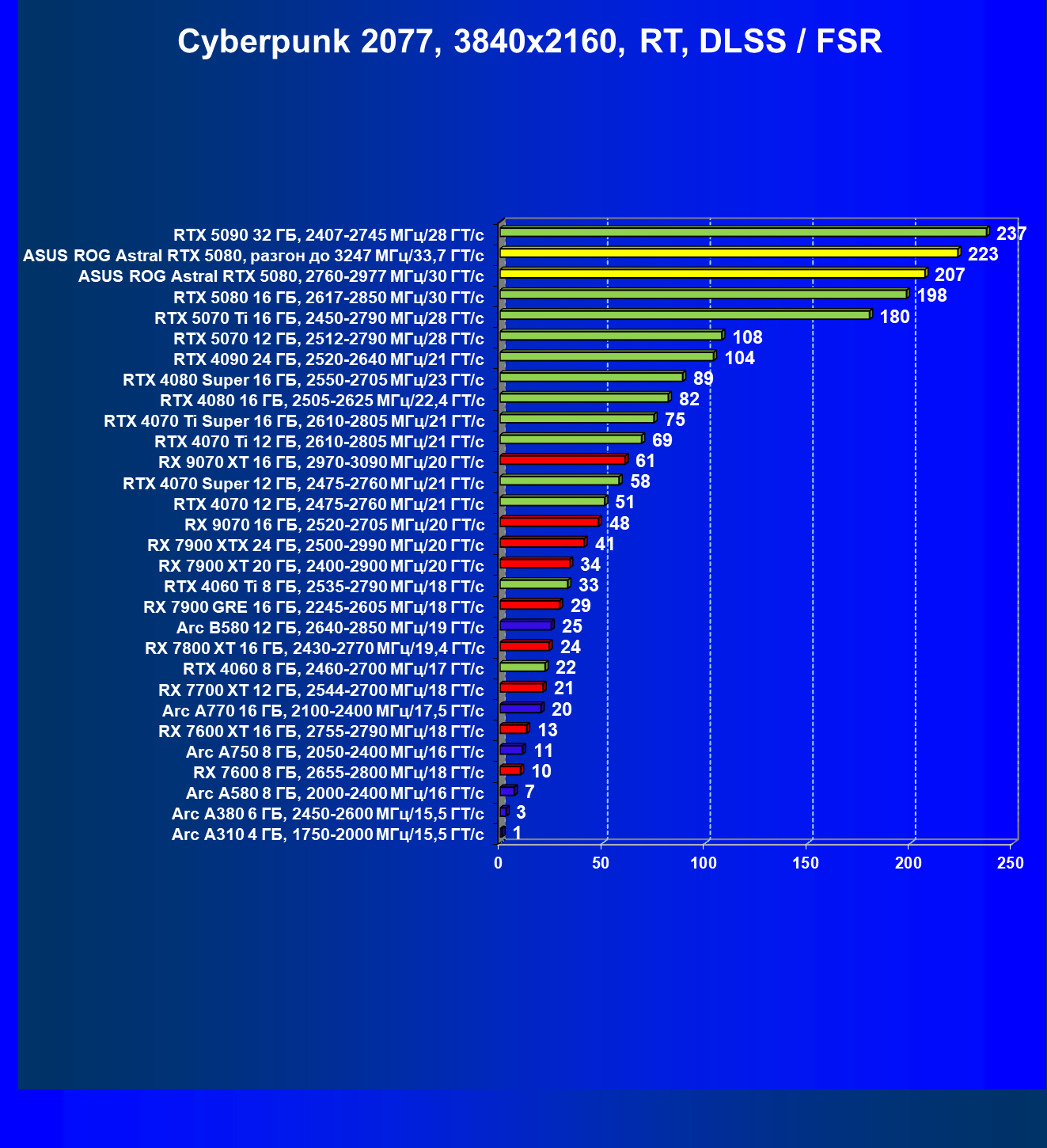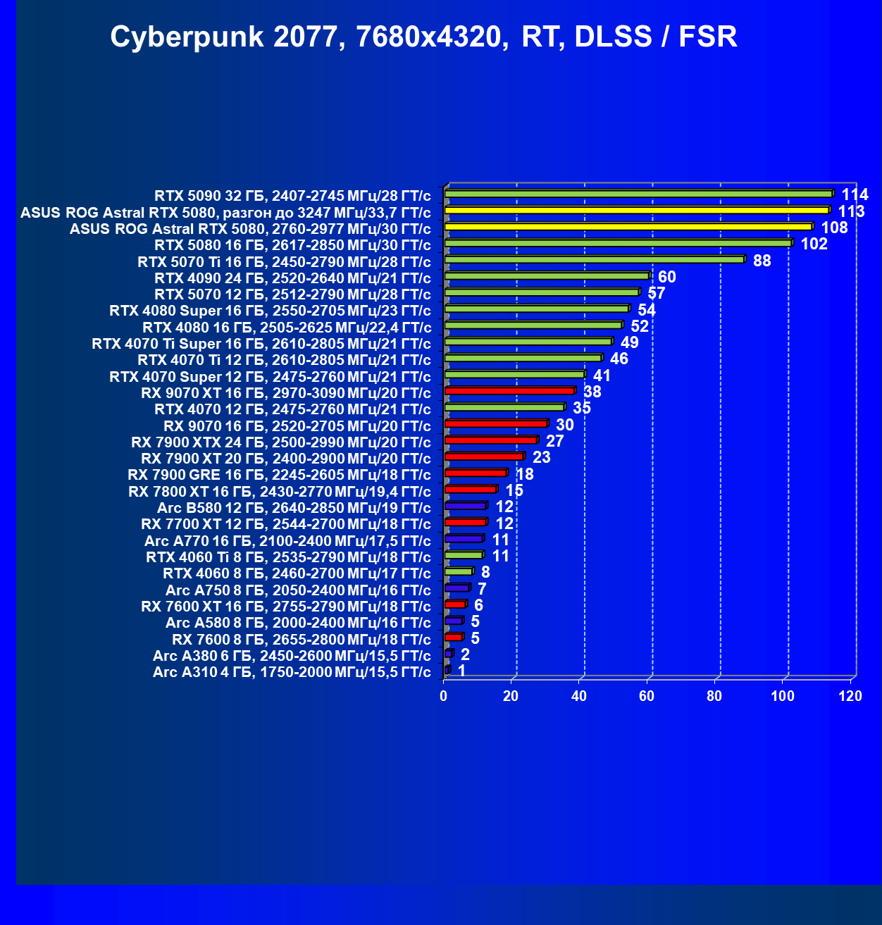 | 24 | RX 7900 XTX 24 ГБ, 2500—2990 МГц/20 ГТ/с | 497 | 6019 | 121 000 |