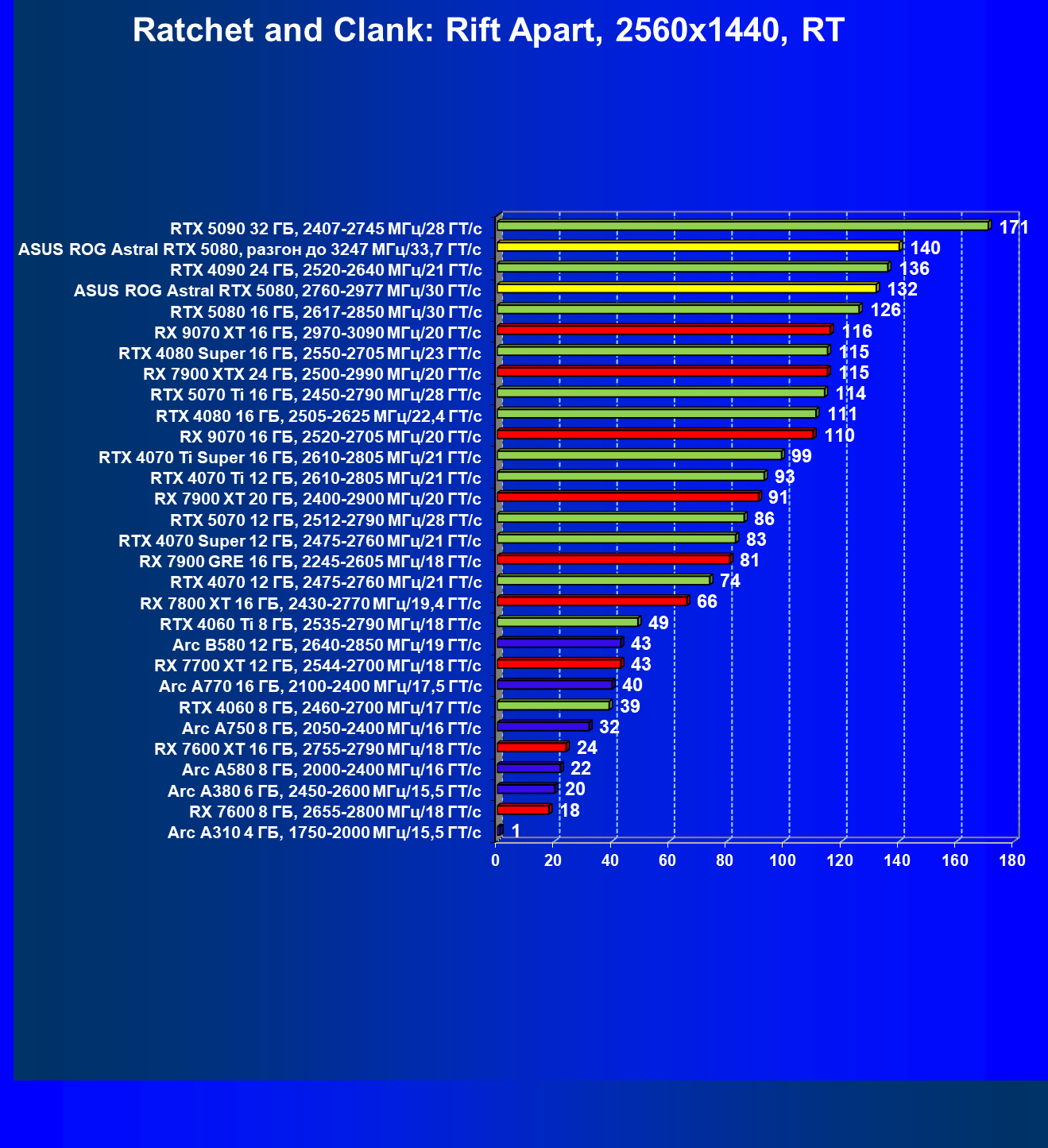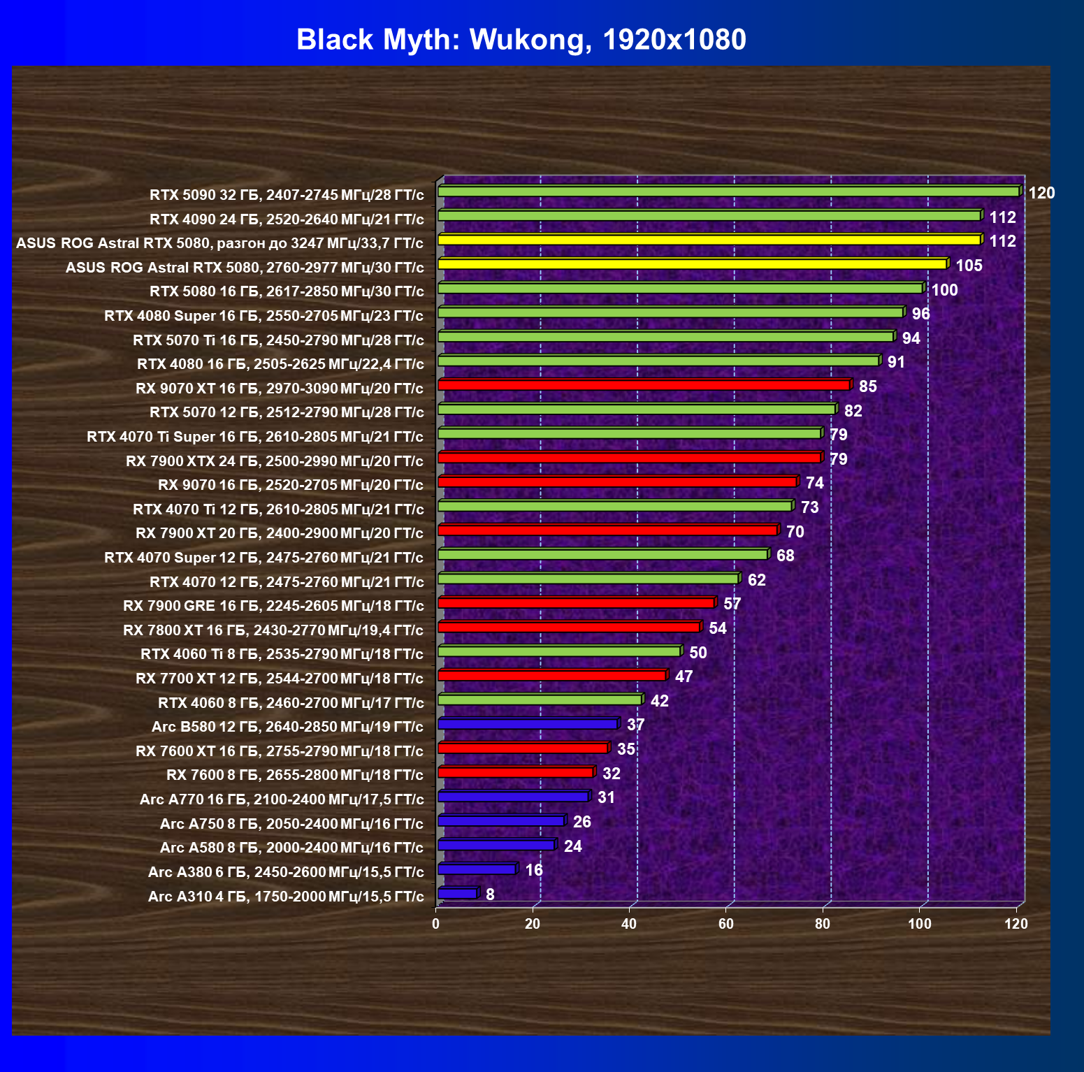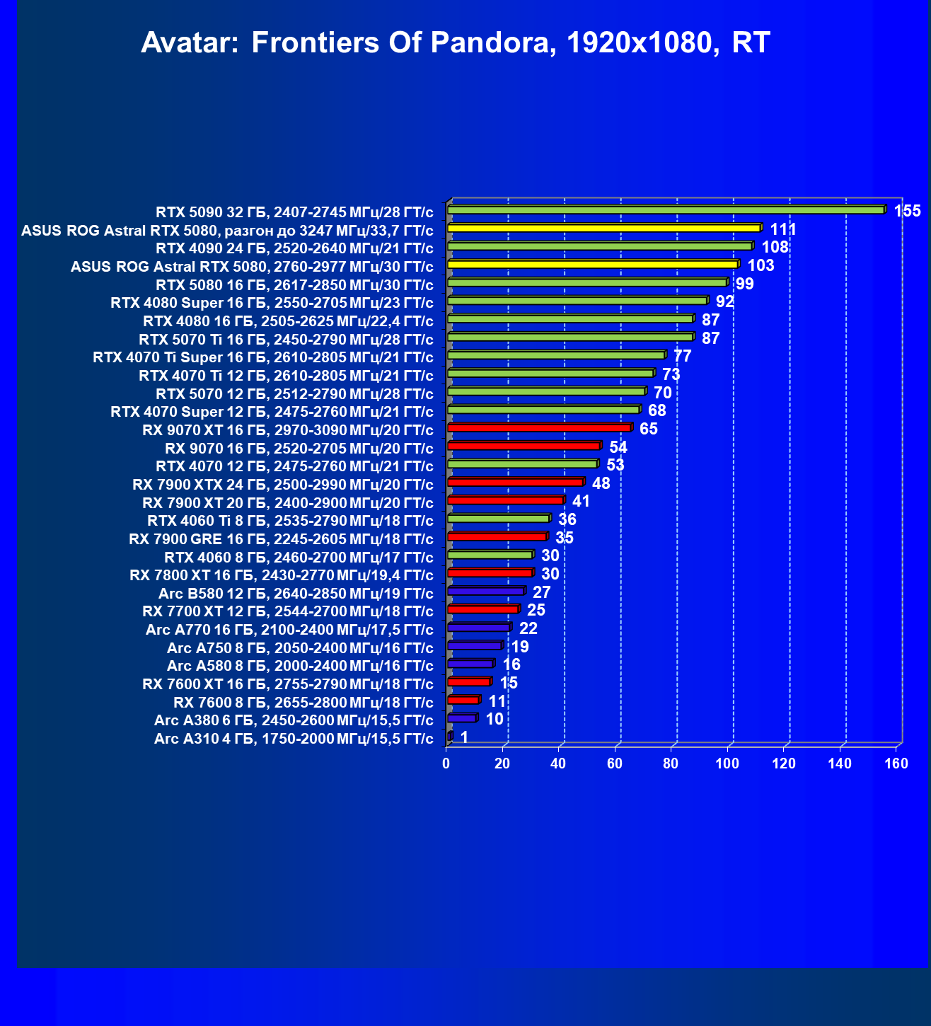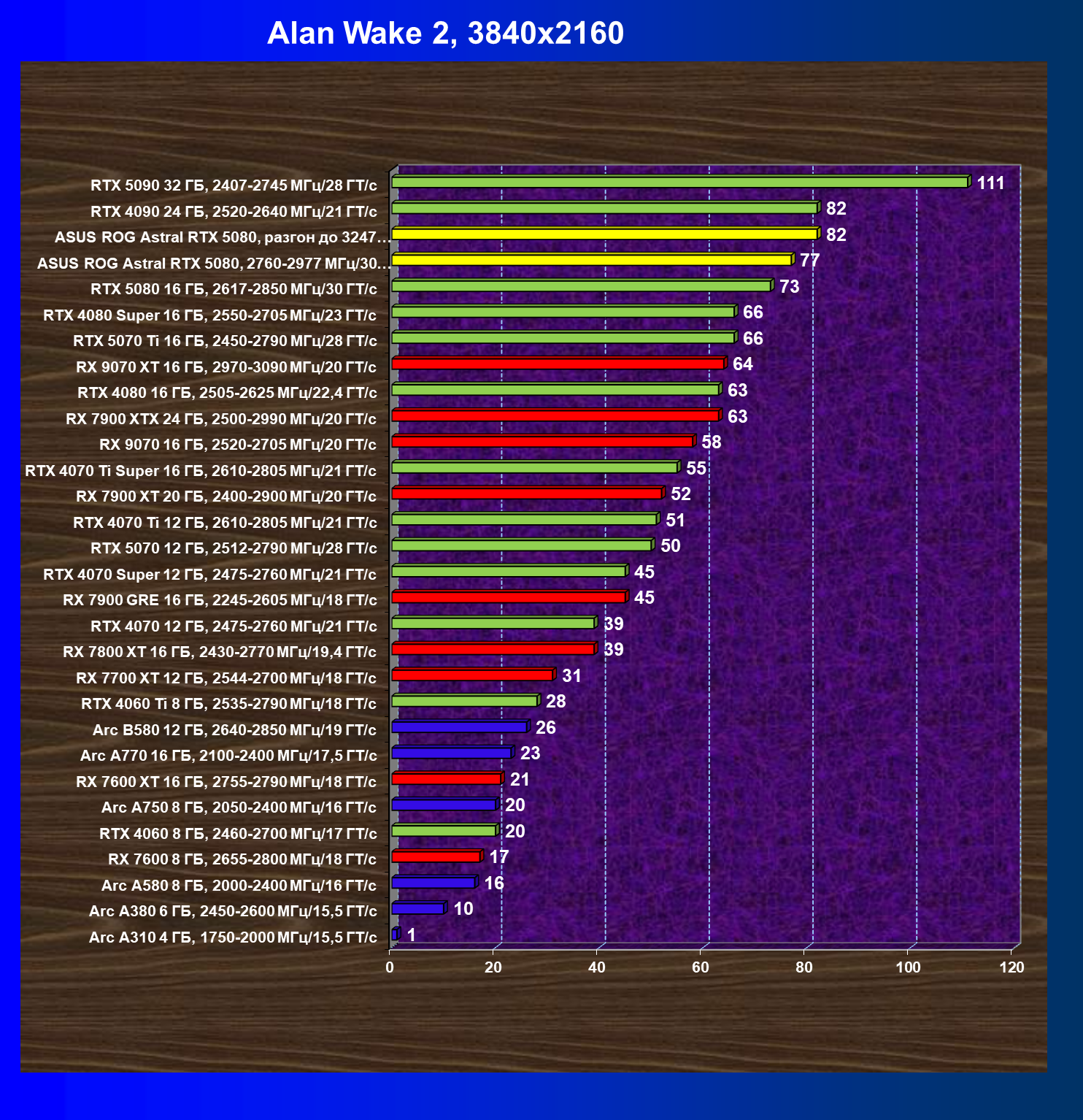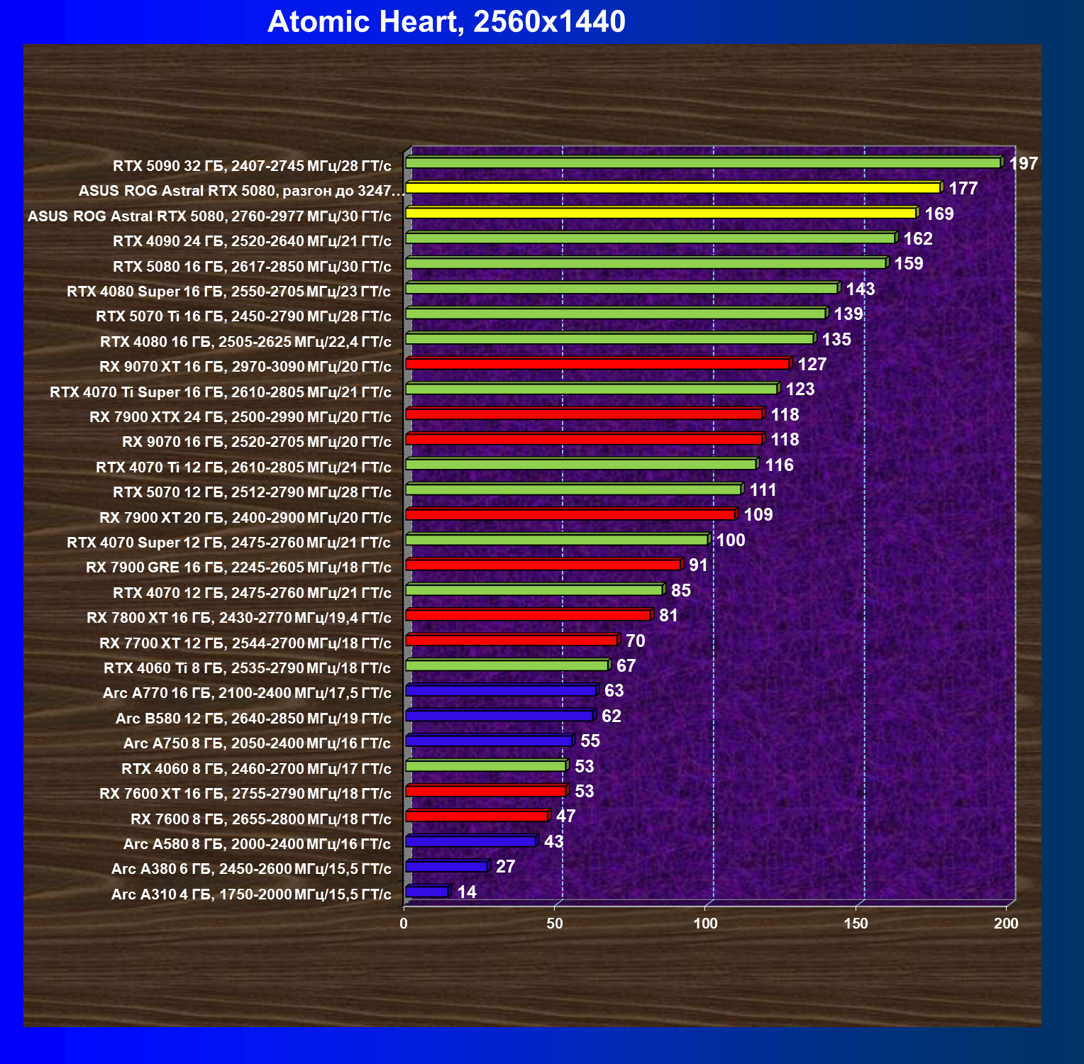 | 06 | Asus ROG Astral RTX 5080, 2760—2977 МГц/30 ГТ/с | 769 | 13838 | 180 000 |
