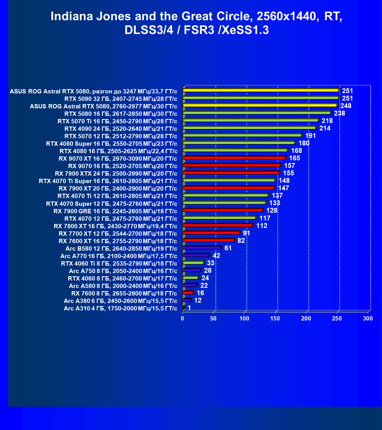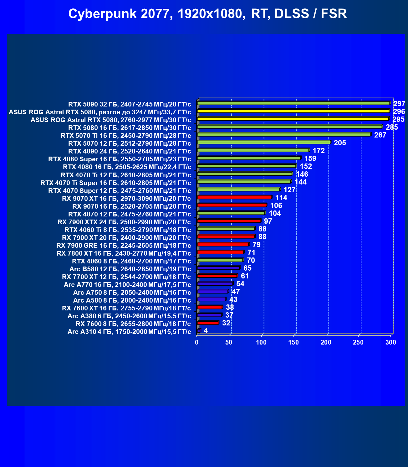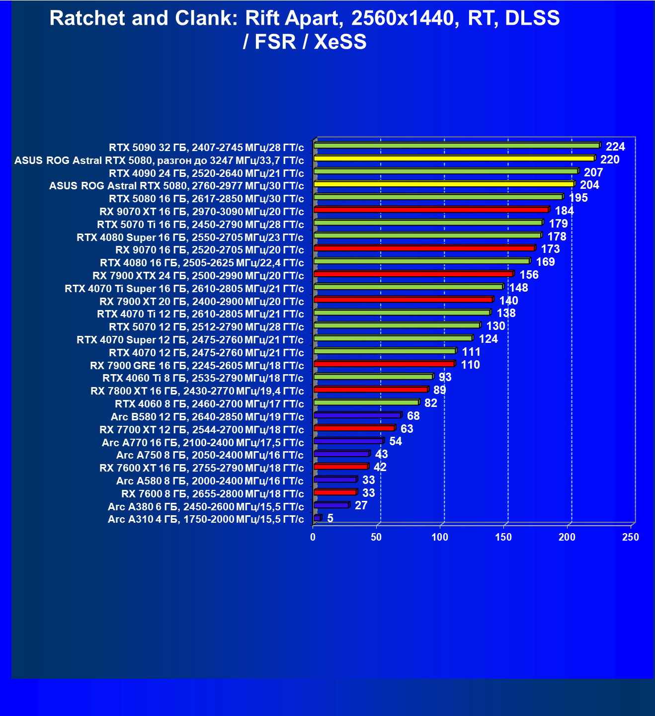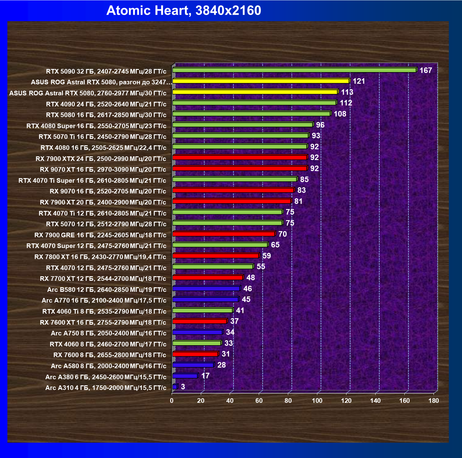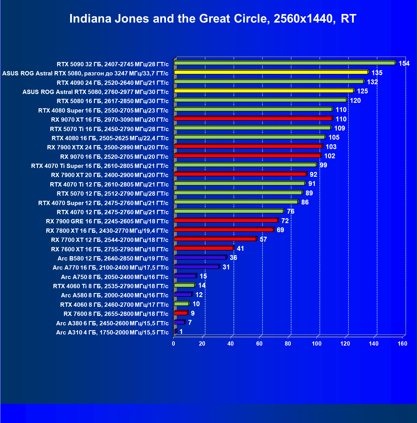 | 25 | Asus ROG Astral RTX 5080, разгон до 3247 МГц/33,7 ГТ/с | 341 | 6132 | 180 000 |