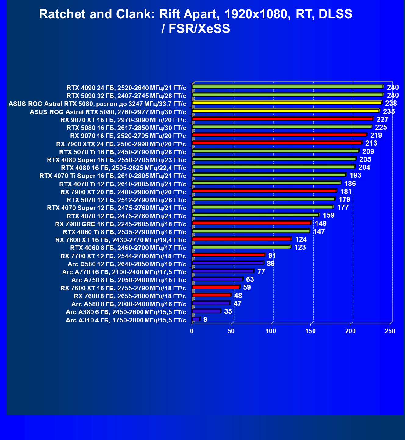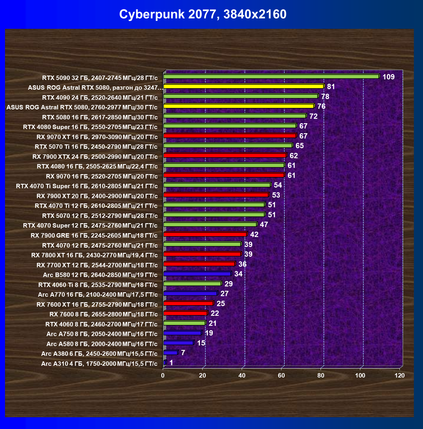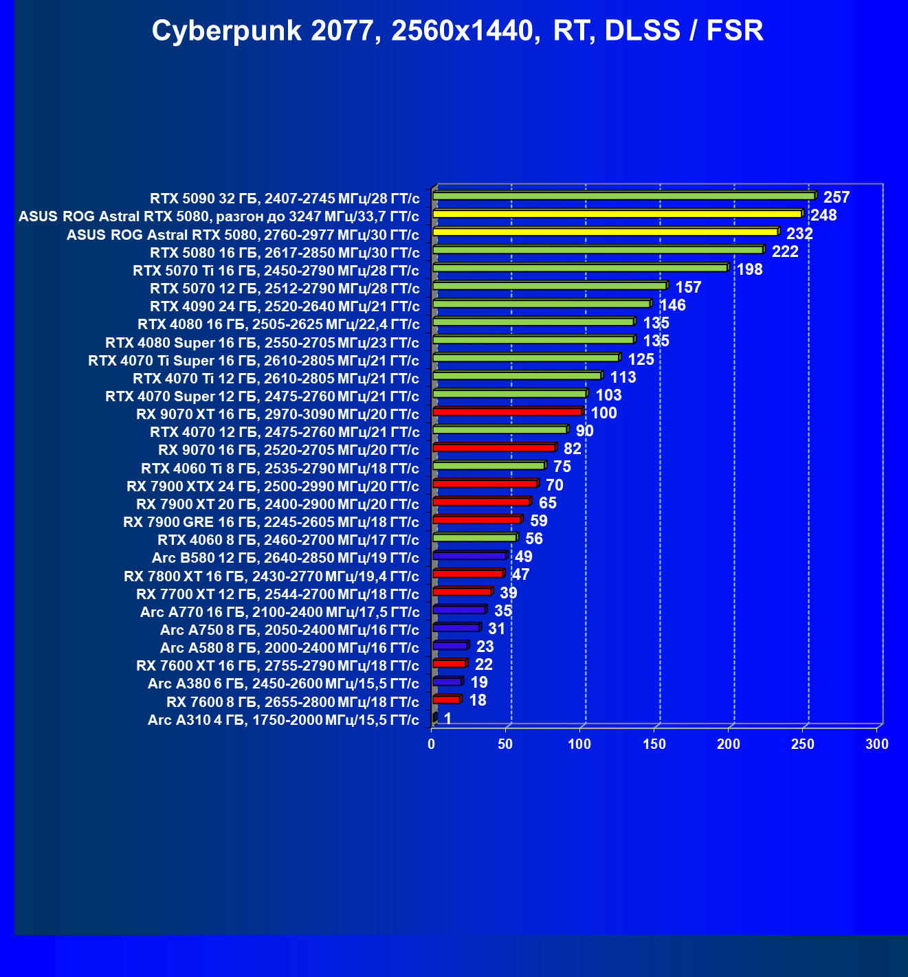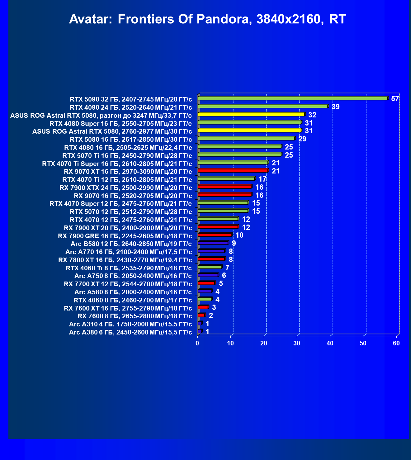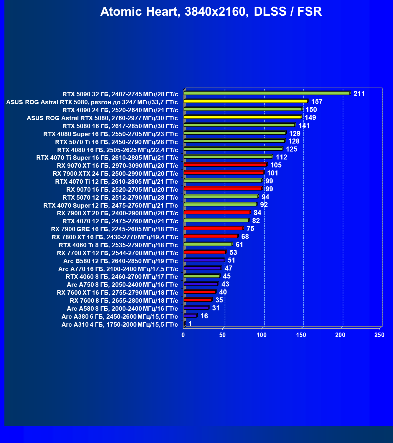 | 25 | Asus ROG Astral RTX 5080, разгон до 3247 МГц/33,7 ГТ/с | 341 | 6132 | 180 000 |