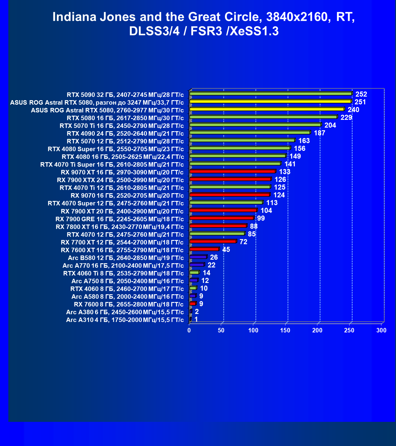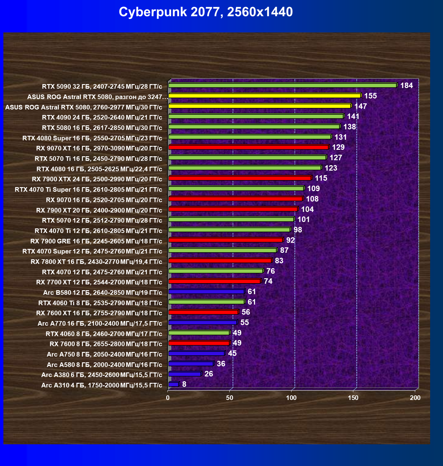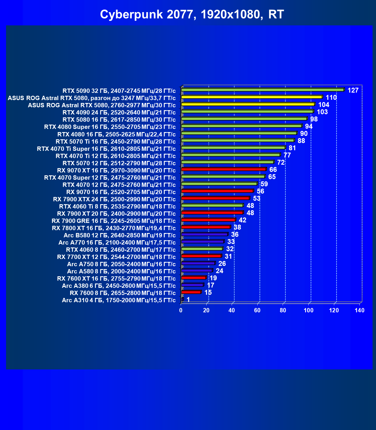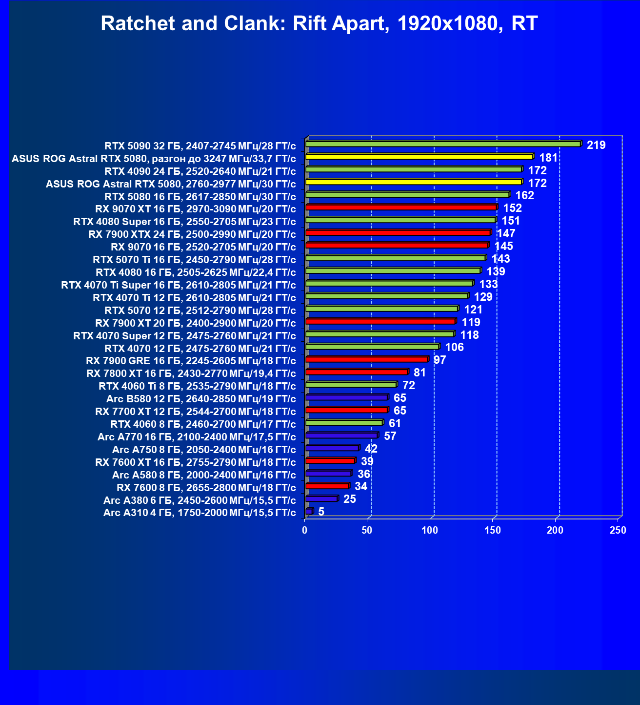 | 25 | Asus ROG Astral RTX 5080, разгон до 3247 МГц/33,7 ГТ/с | 341 | 6132 | 180 000 |
