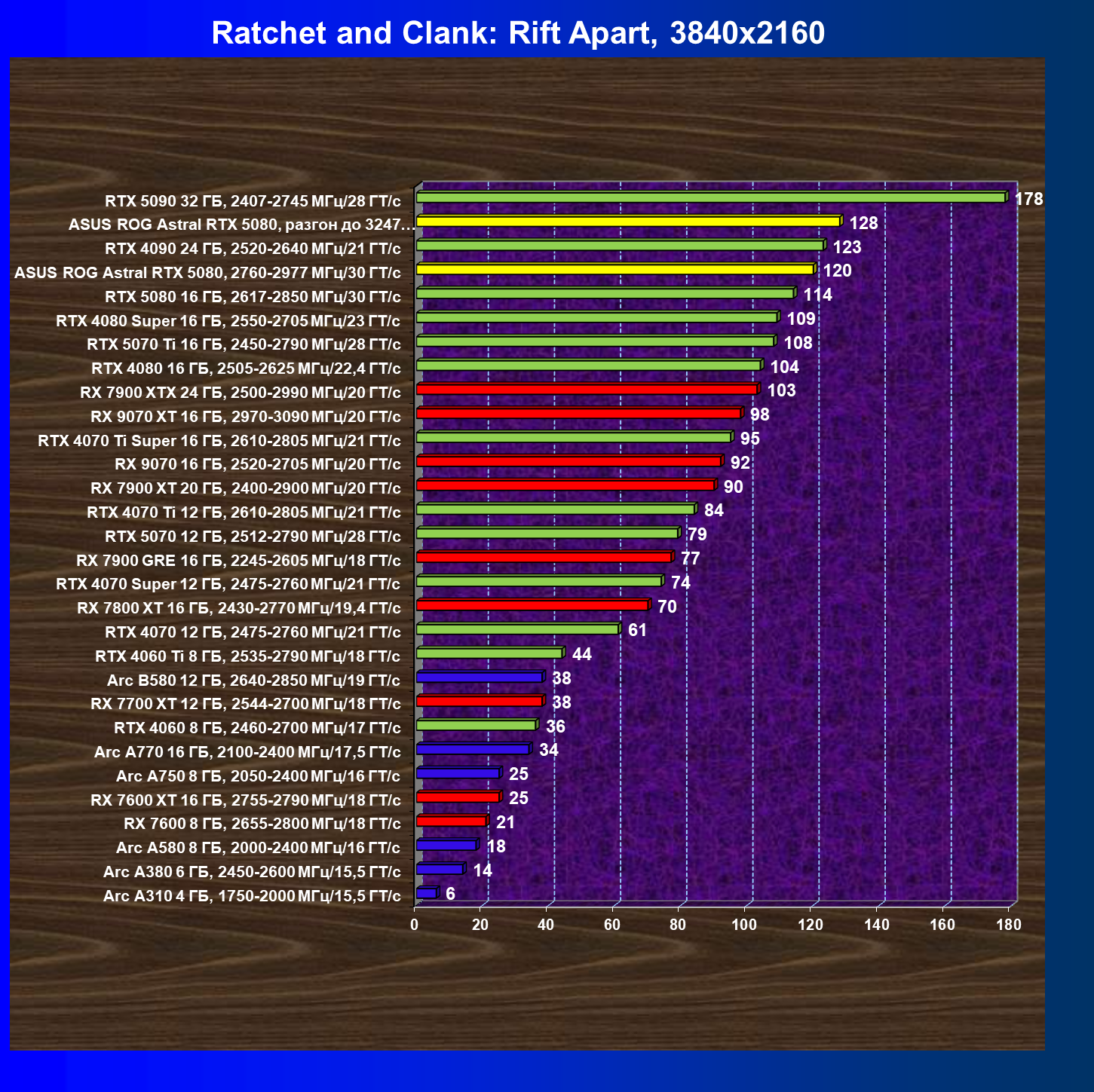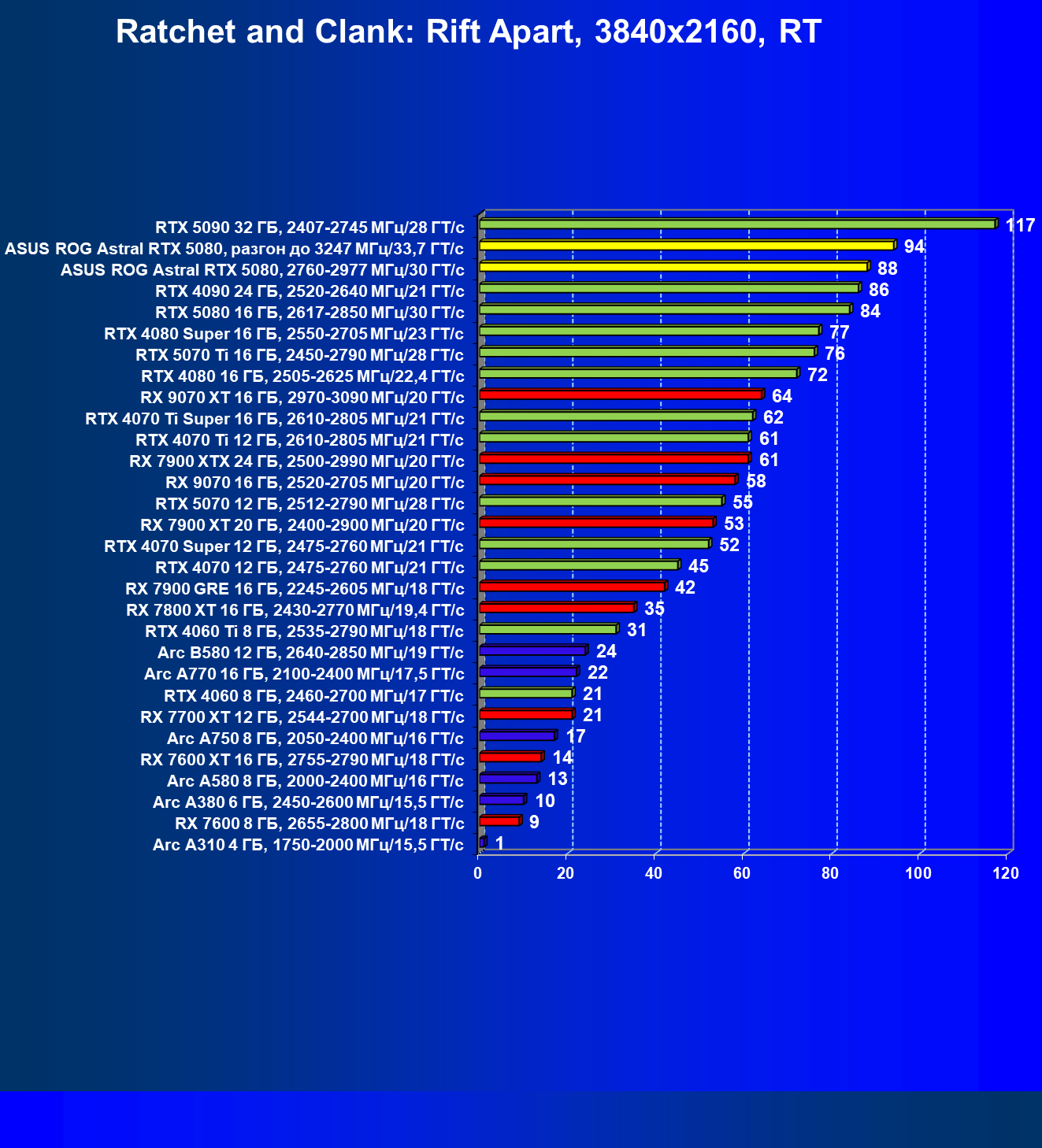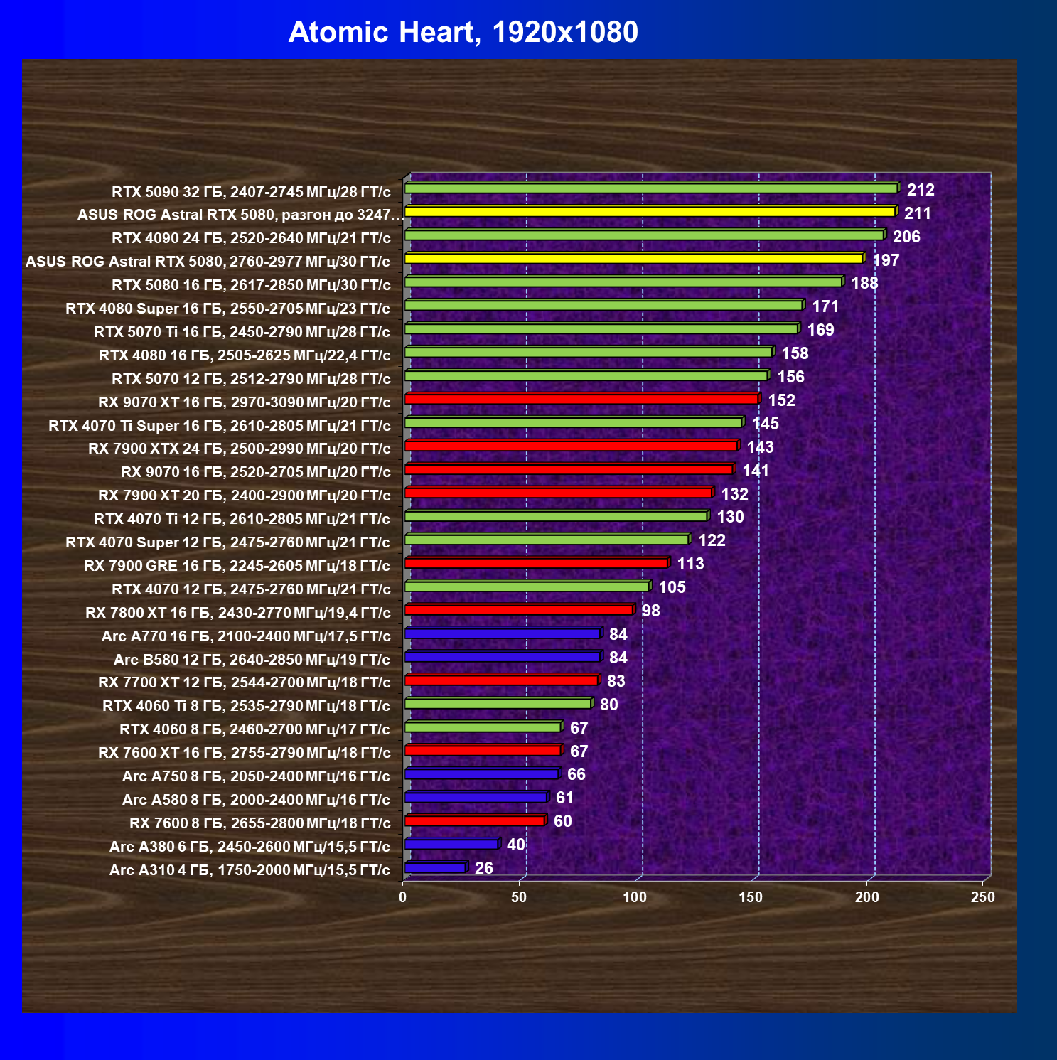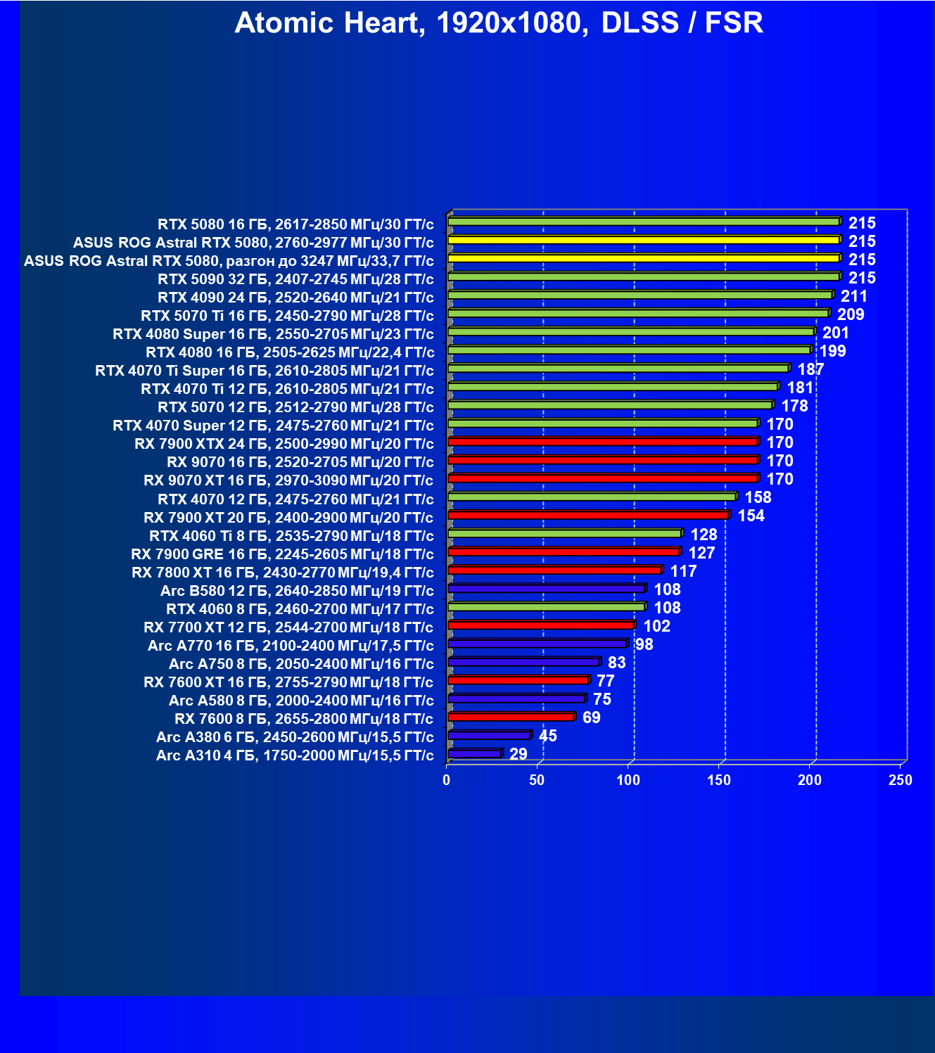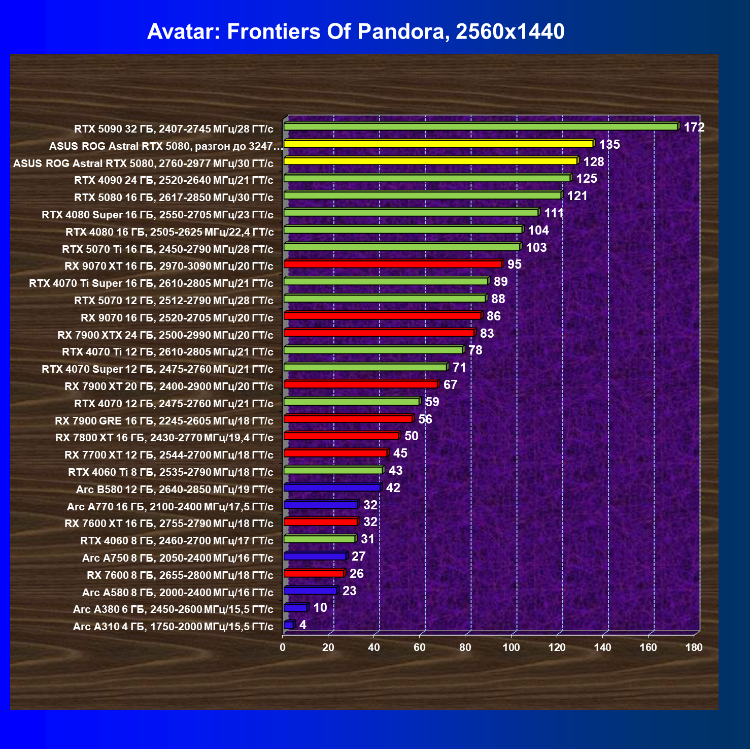| 25 | Asus ROG Astral RTX 5080, разгон до 3247 МГц/33,7 ГТ/с | 341 | 6132 | 180 000 |