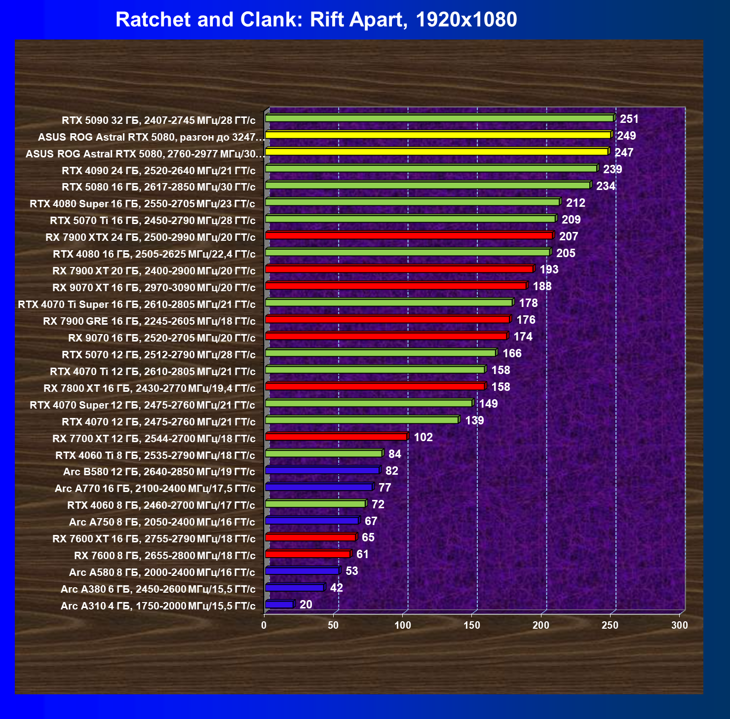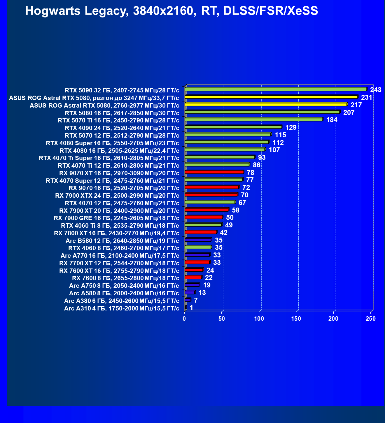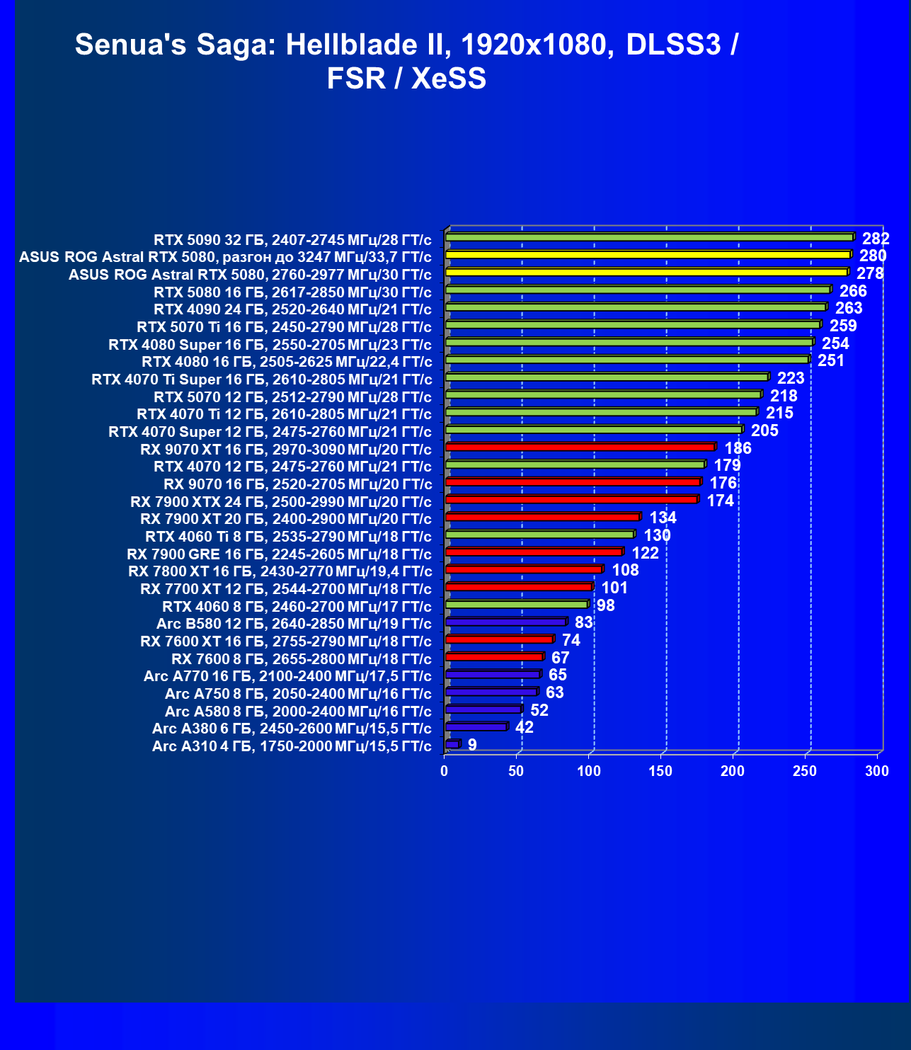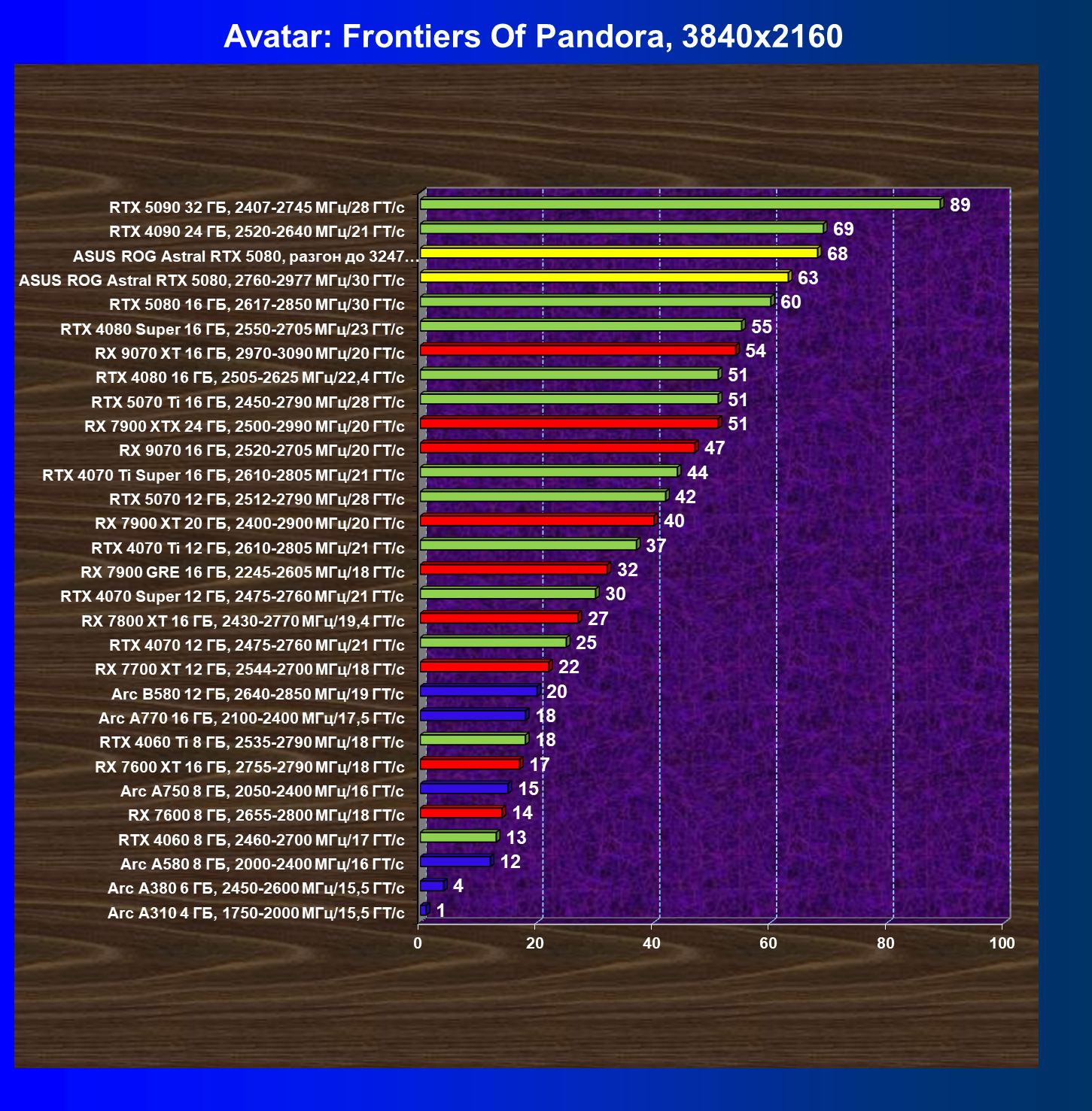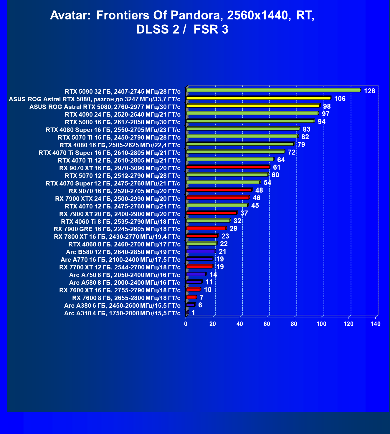 | 25 | Asus ROG Astral RTX 5080, разгон до 3247 МГц/33,7 ГТ/с | 341 | 6132 | 180 000 |