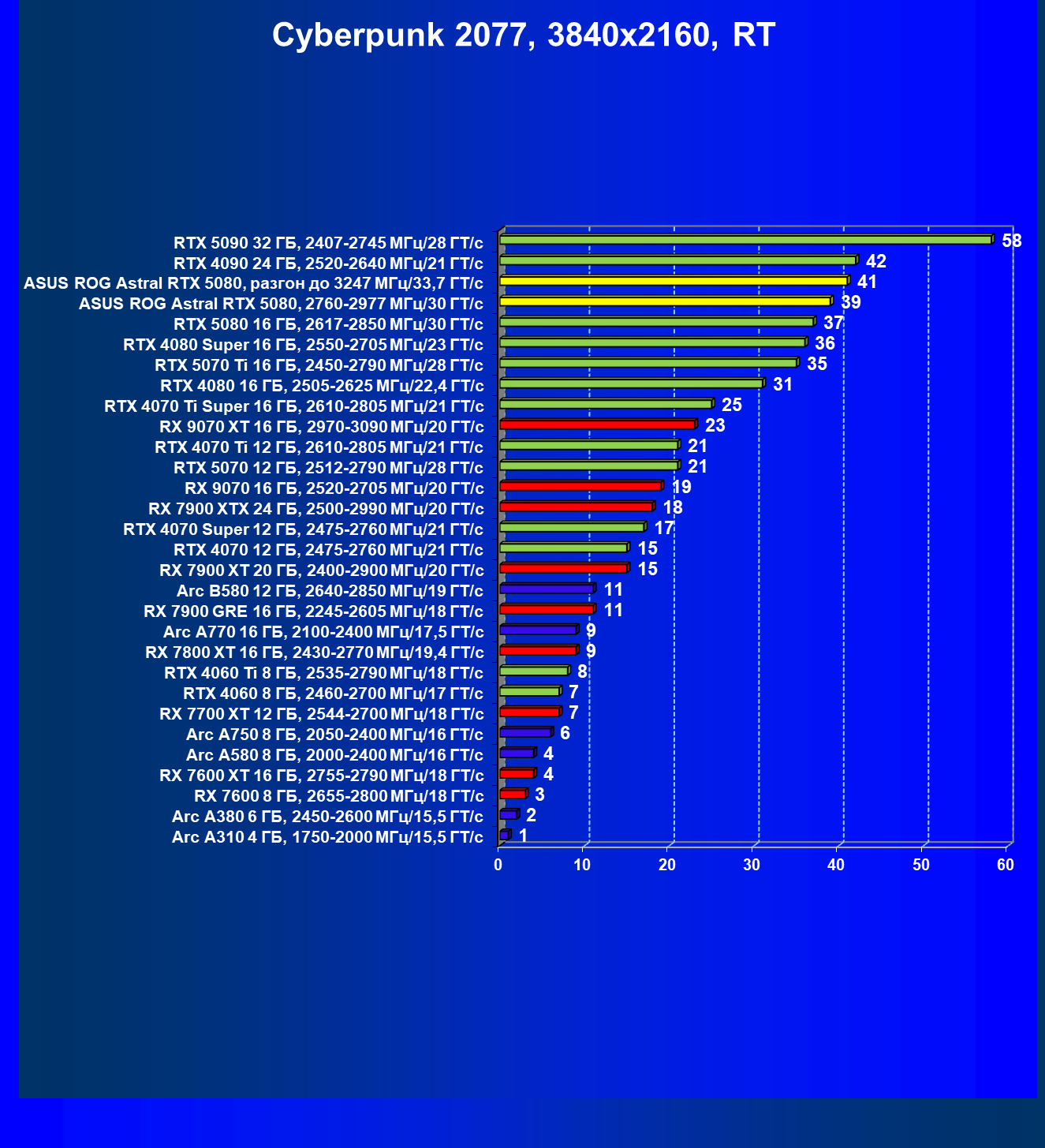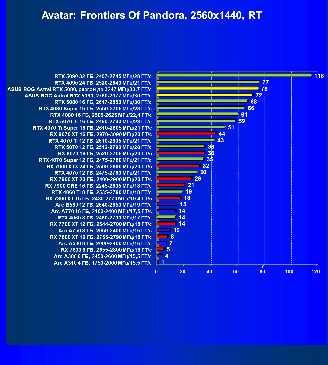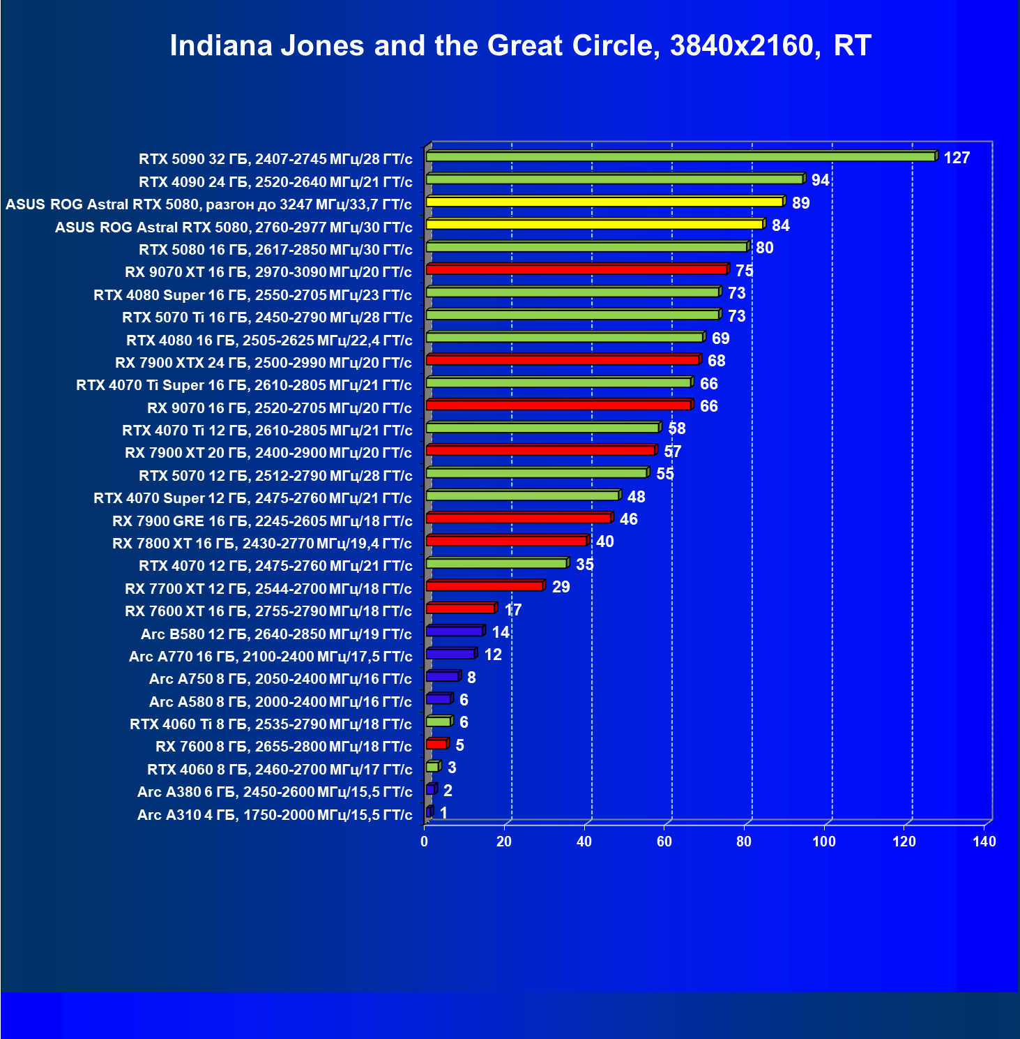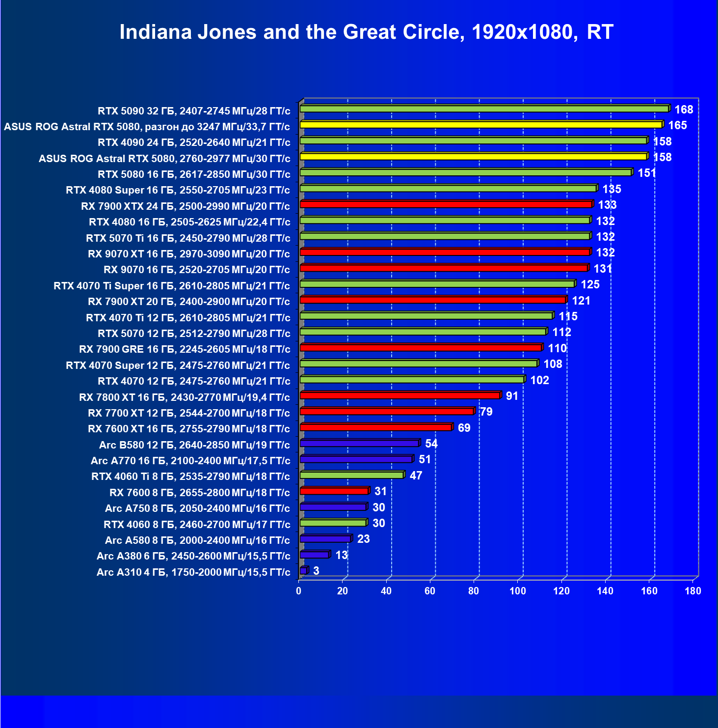 | 03 | Asus ROG Astral RTX 5080, 2760—2977 МГц/30 ГТ/с | 13838 | 769 | 180 000 |