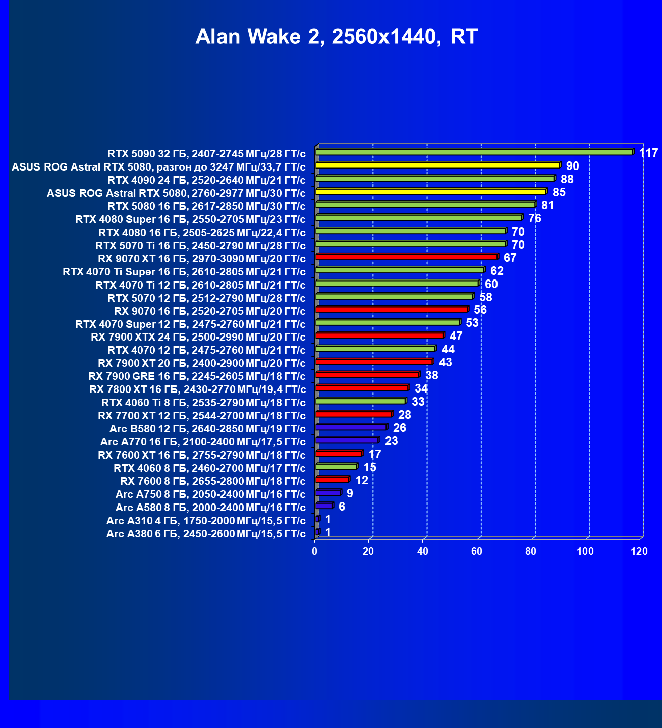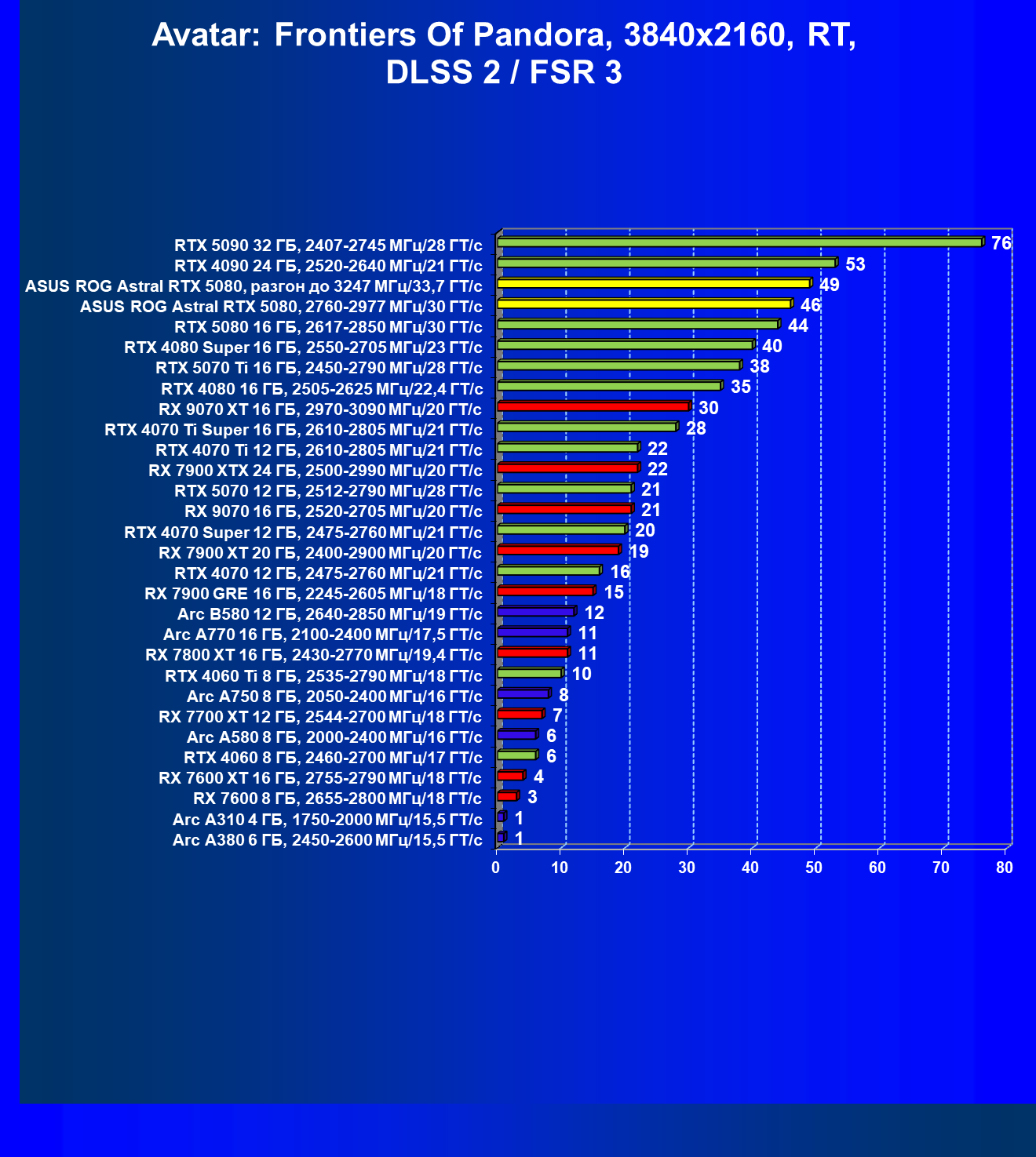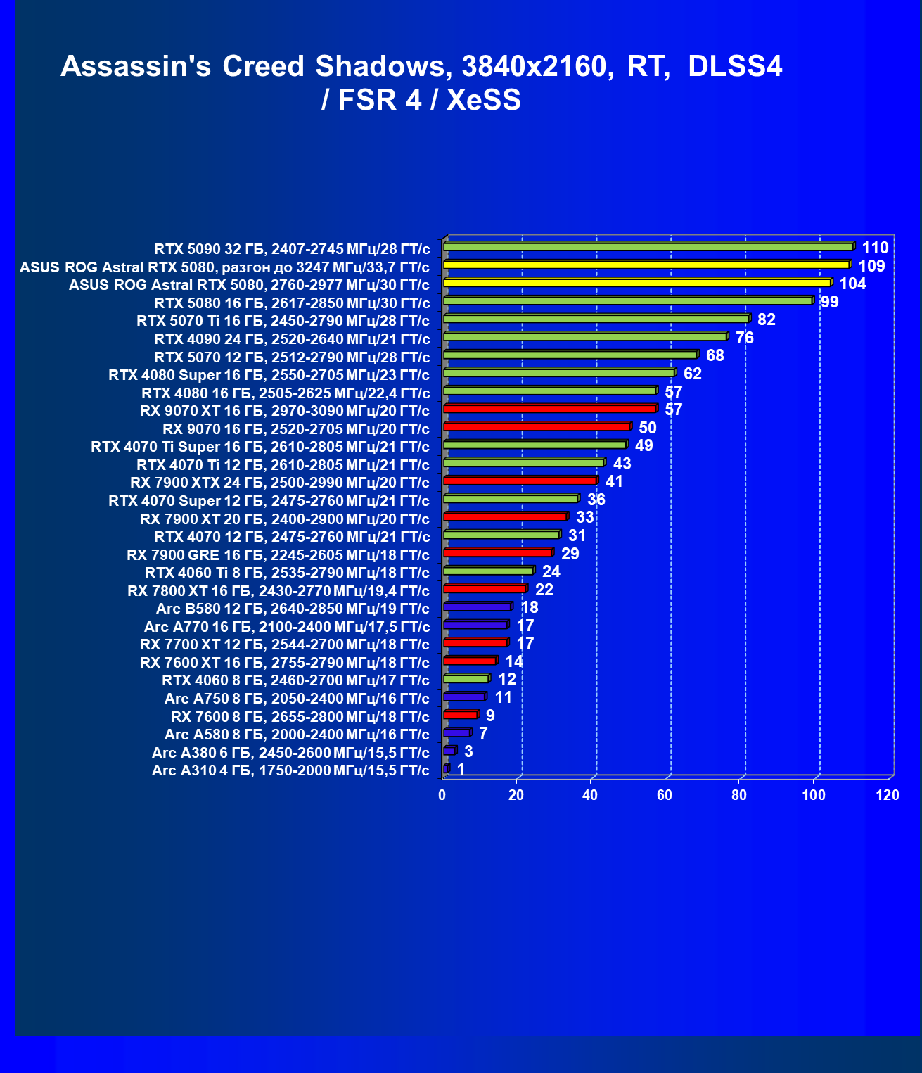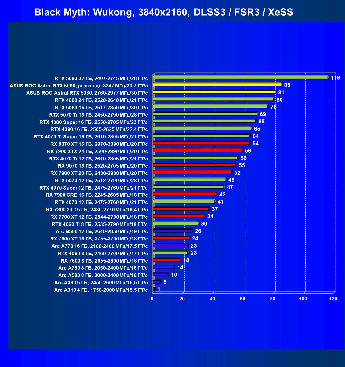 | 03 | Asus ROG Astral RTX 5080, 2760—2977 МГц/30 ГТ/с | 13838 | 769 | 180 000 |
