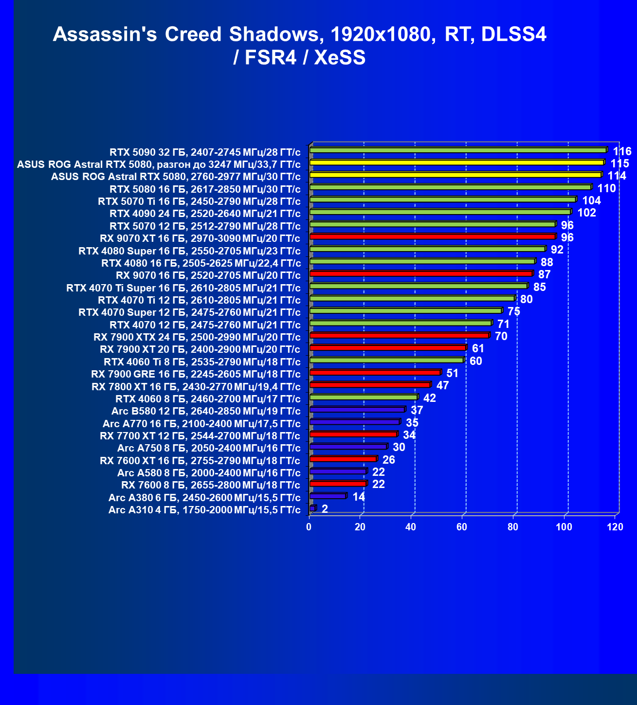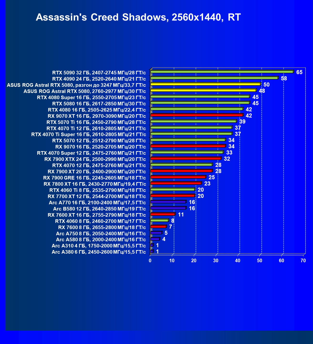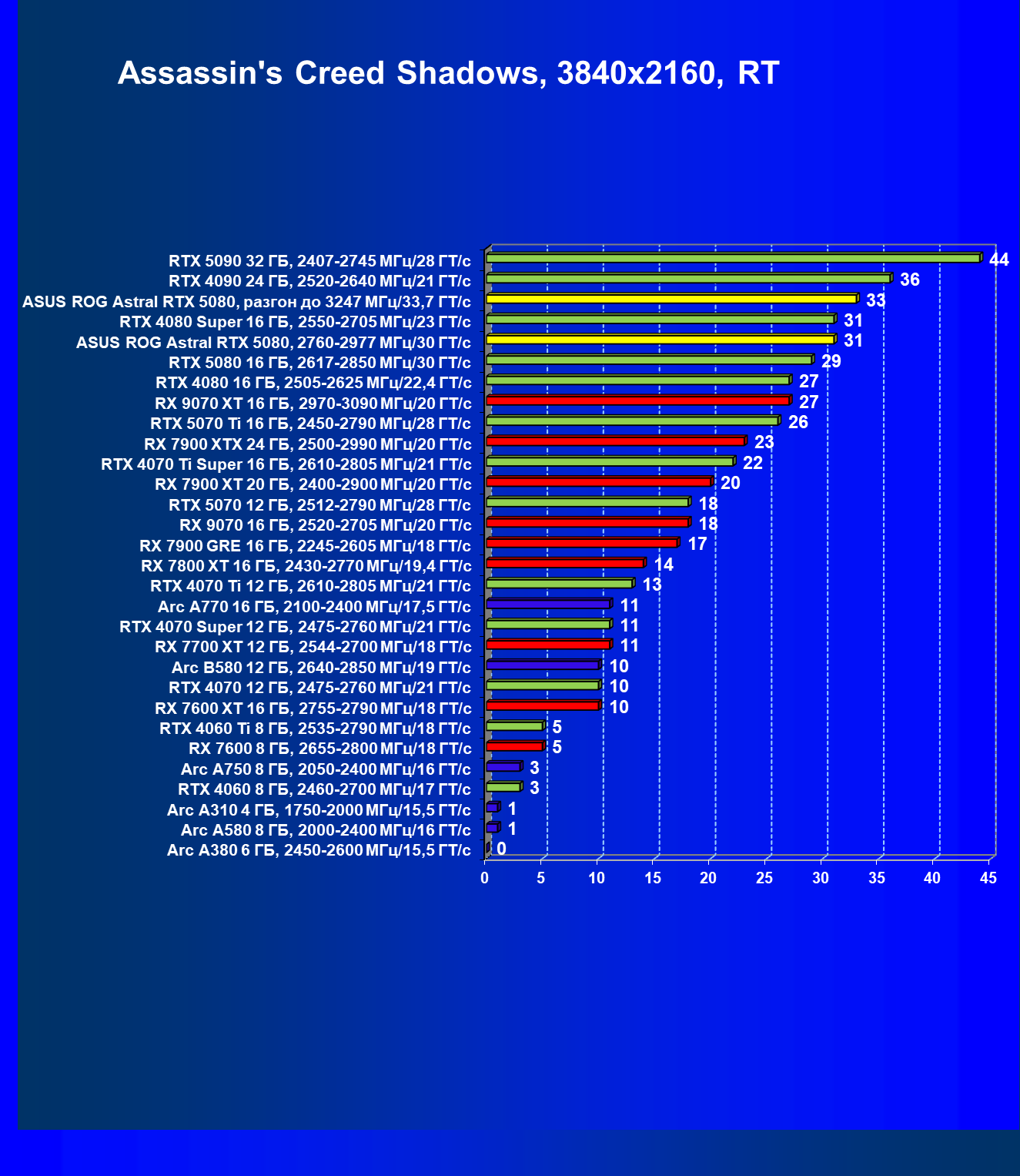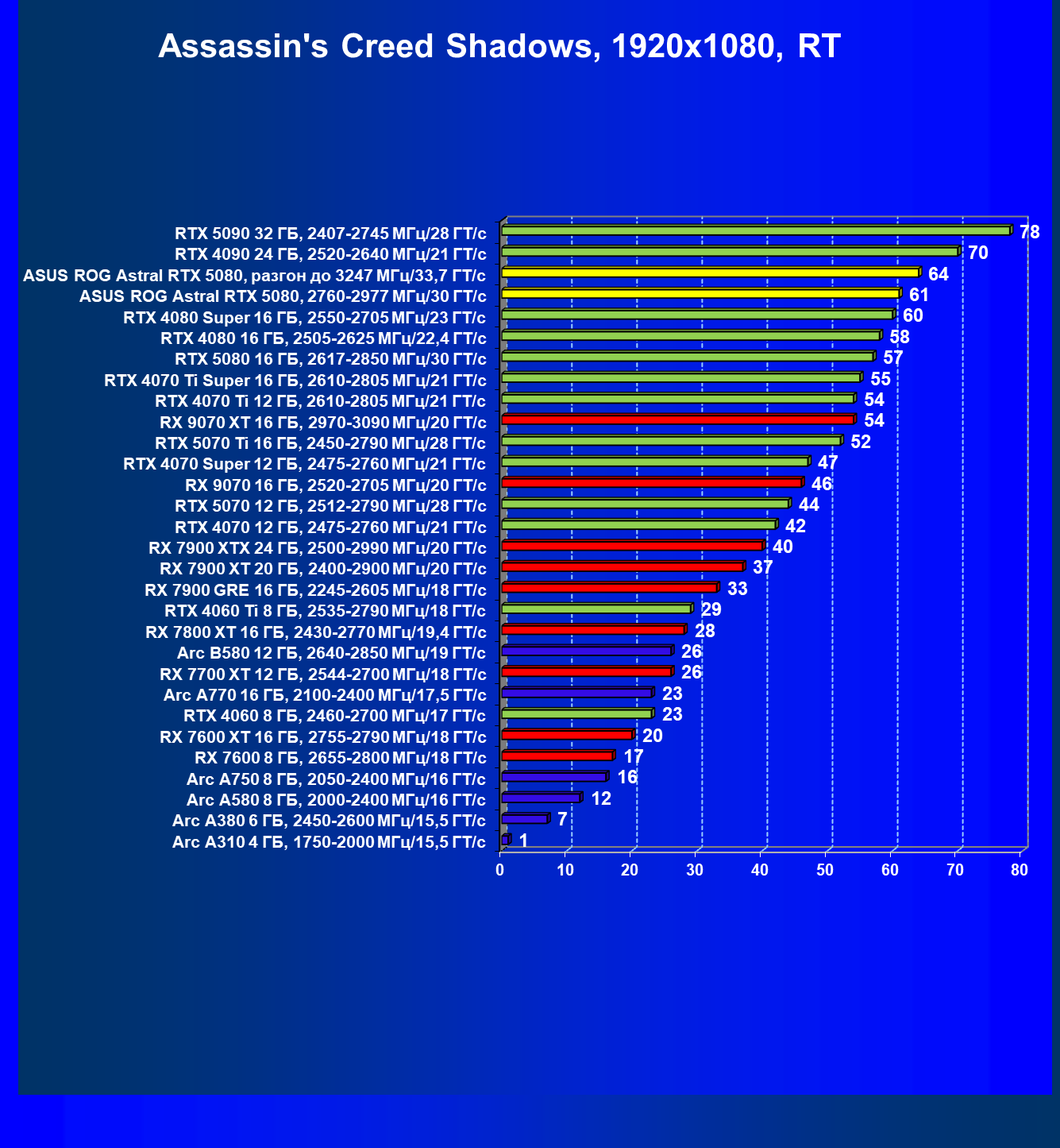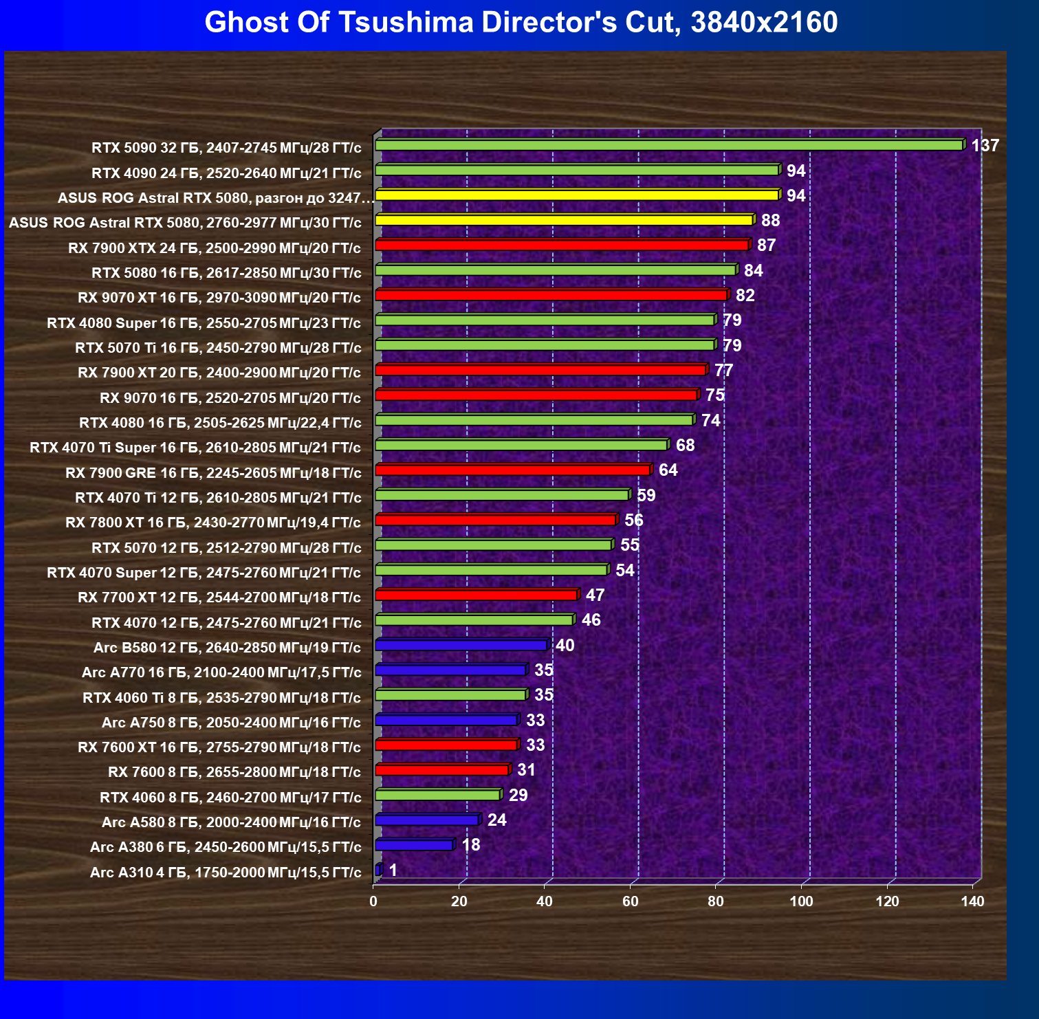 | 03 | Asus ROG Astral RTX 5080, 2760—2977 МГц/30 ГТ/с | 13838 | 769 | 180 000 |