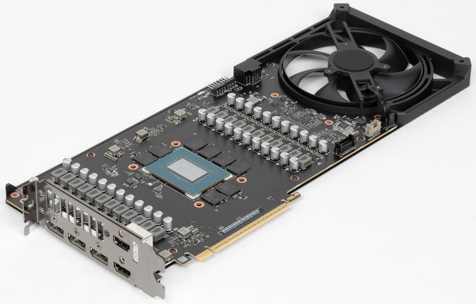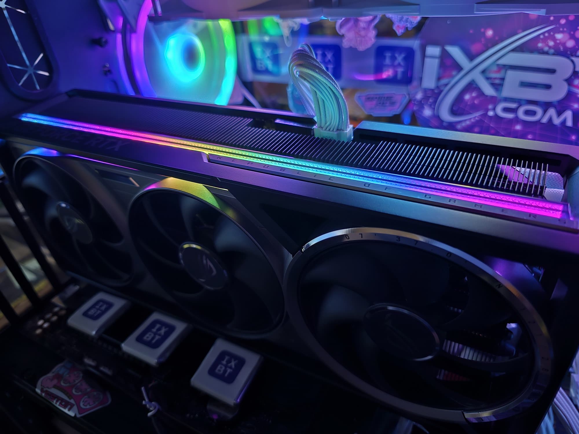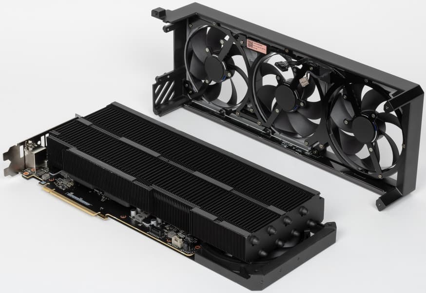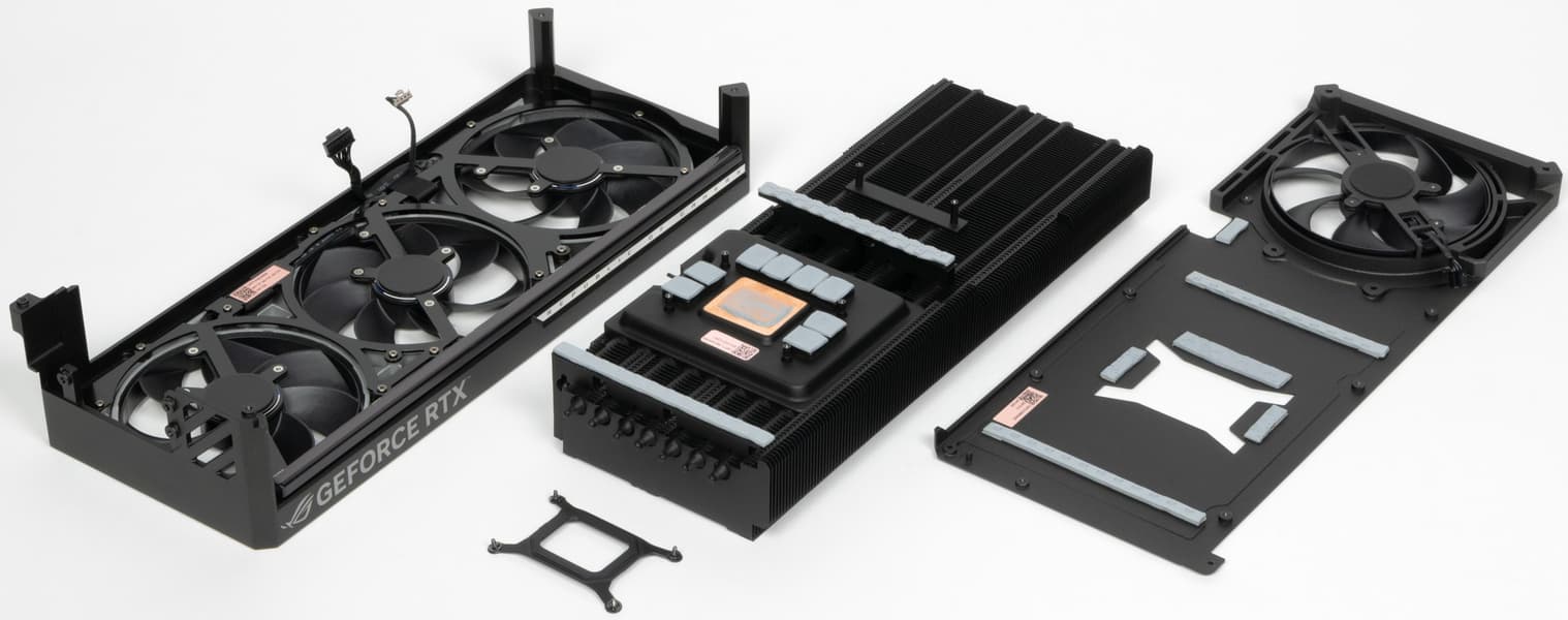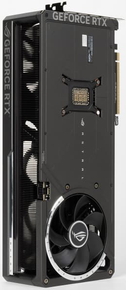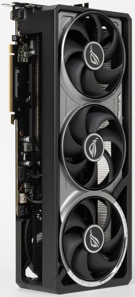 Система охлаждения крайне мощная, высокоэффективная, а в режиме BIOS Q mode — еще и тихая. Как следствие, карта очень массивная и имеет большие размеры: 36 см в длину и 15 см в высоту, а по толщине она занимает 4 слота в корпусе. Набор видеовыходов — 3 DP 2.1b и 2 HDMI 2.1b, но одновременно можно подключить те же 4 приемника сигнала. Подсветка простая, ее можно синхронизировать с материнскими платами Asus через приложение Armoury Crate.