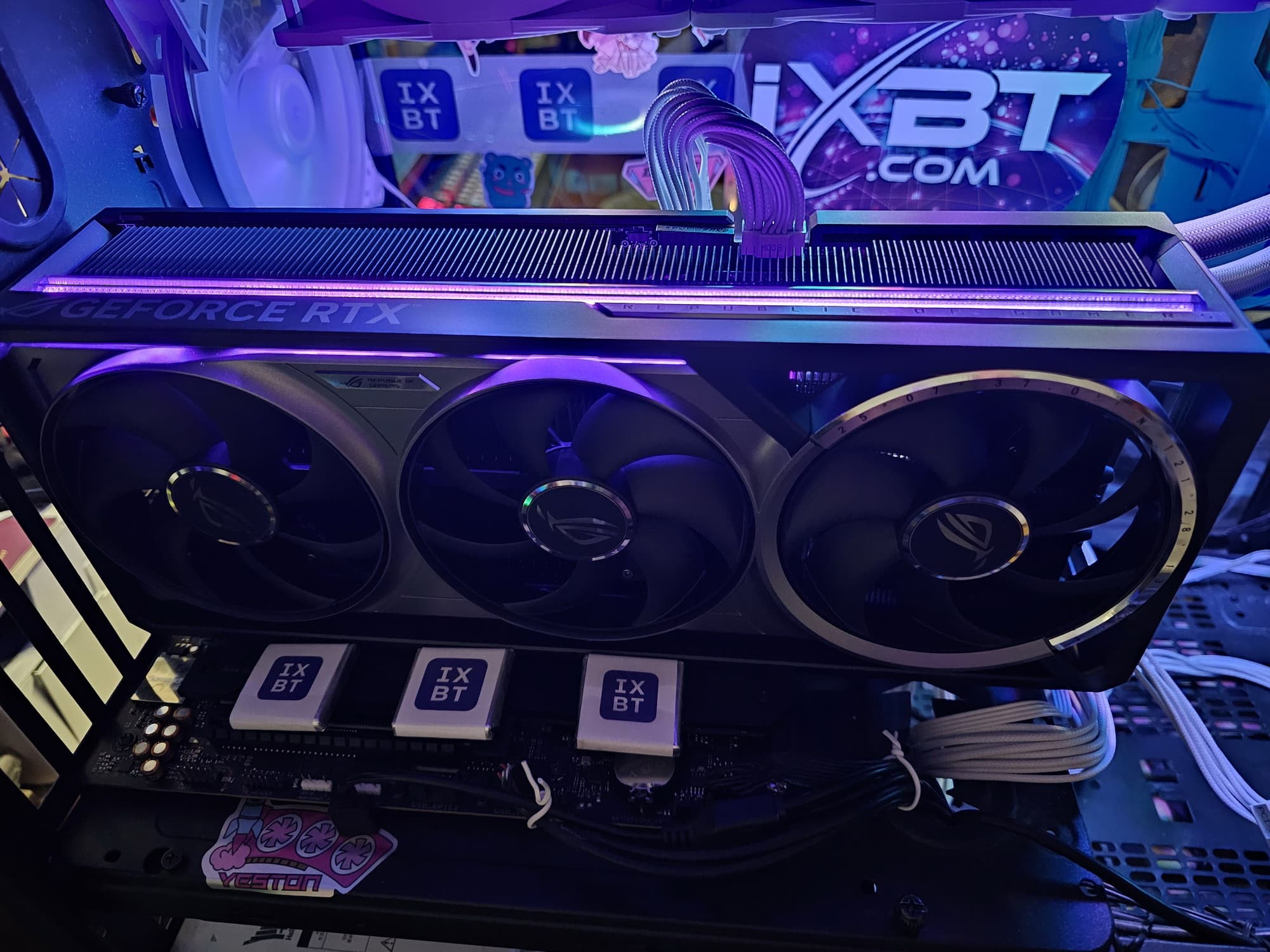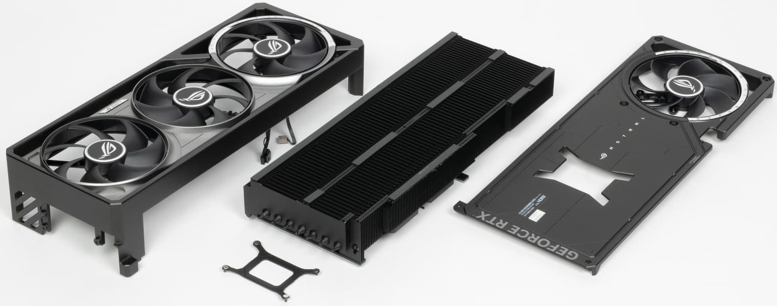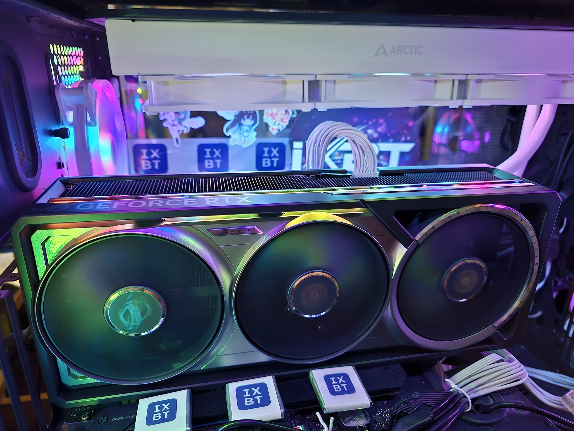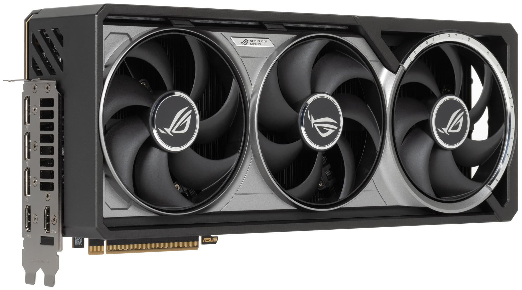 Система охлаждения крайне мощная, высокоэффективная, а в режиме BIOS Q mode — еще и тихая. Как следствие, карта очень массивная и имеет большие размеры: 36 см в длину и 15 см в высоту, а по толщине она занимает 4 слота в корпусе. Набор видеовыходов — 3 DP 2.1b и 2 HDMI 2.1b, но одновременно можно подключить те же 4 приемника сигнала. Подсветка простая, ее можно синхронизировать с материнскими платами Asus через приложение Armoury Crate.