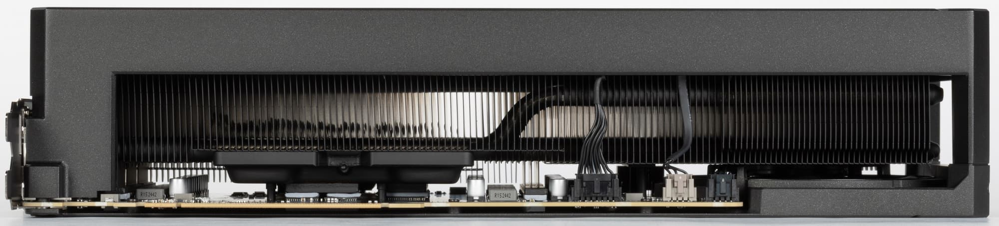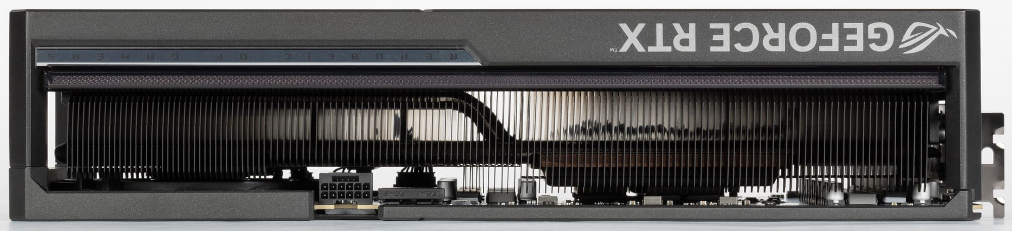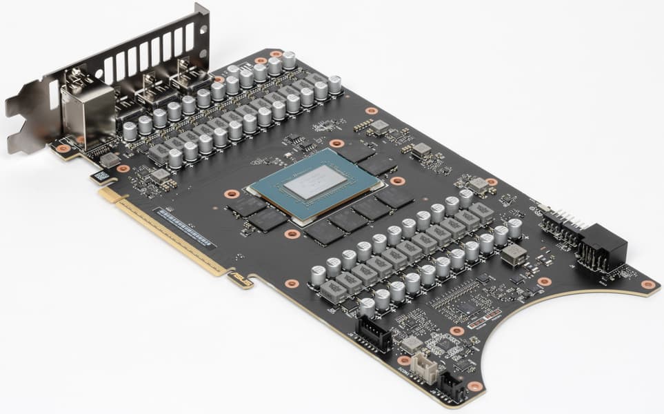 Конечно же, платы кардинально отличаются. Не претерпела изменений лишь область GPU+VRAM. PCB у карт Asus и Palit по высоте примерно равны, однако из-за необходимости размещения огромного количества фаз питания, коннекторов для корпусных вентиляторов ее длина существенно выросла. А из-за необходимости установки 4го вентилятора на обороте карты печатная плата получила характерный полукруглый вырез.