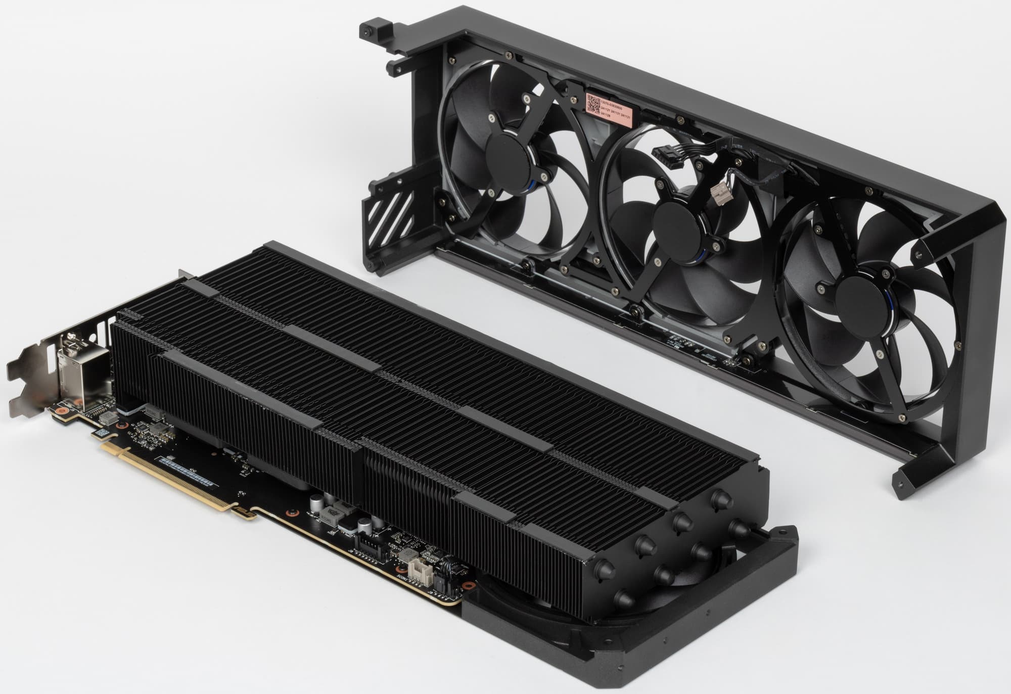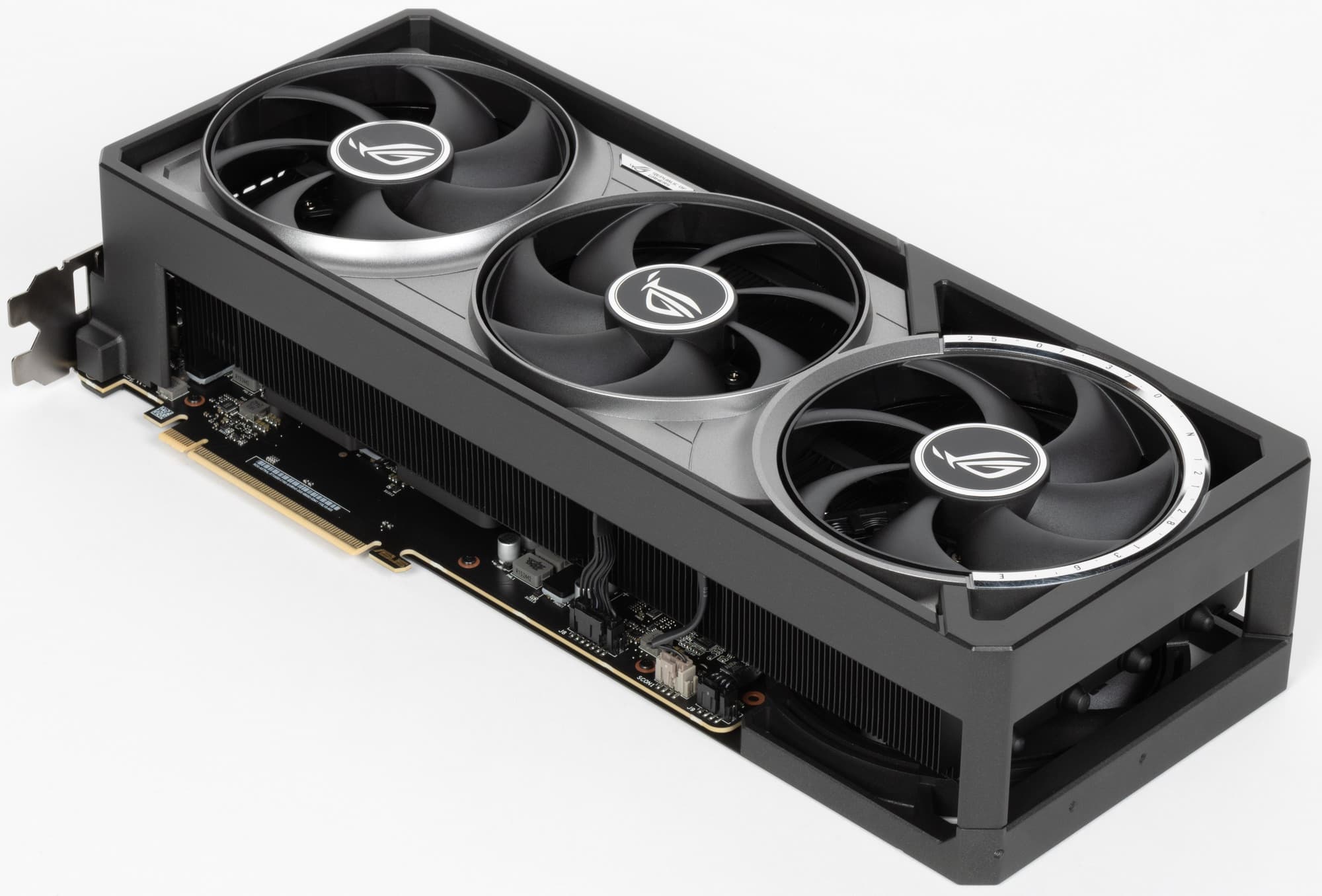 Карта Asus имеет 16-контактный разъем питания версии PCIe 5.0. Хотя в комплекте поставки имеется адаптер-переходник для подключения разъемов питания типа PCIe 2.0 (с 3 таких разъемов), лучше всё же использовать блоки питания стандарта ATX 3.0 с полноценной поддержкой питания PCIe 5.0 (с кабелем 12VHPWR). Имеющийся же переходник питания ни в коем случае нельзя изгибать непосредственно после 16-контактного разъема.