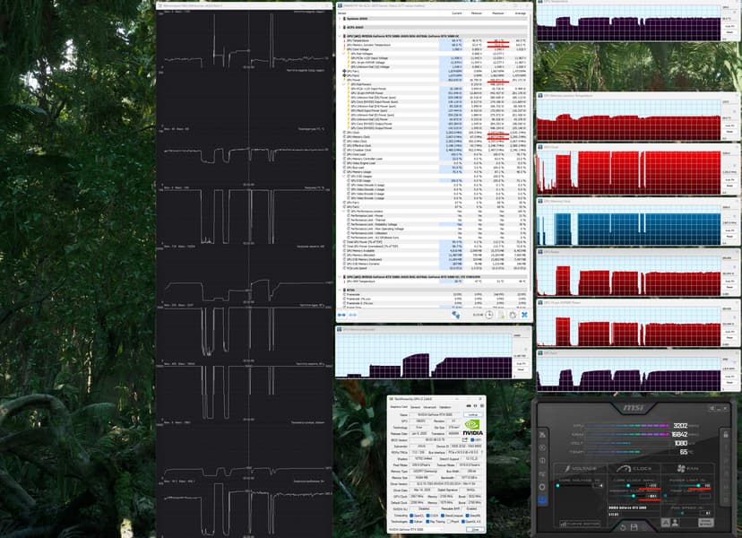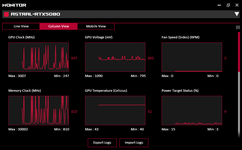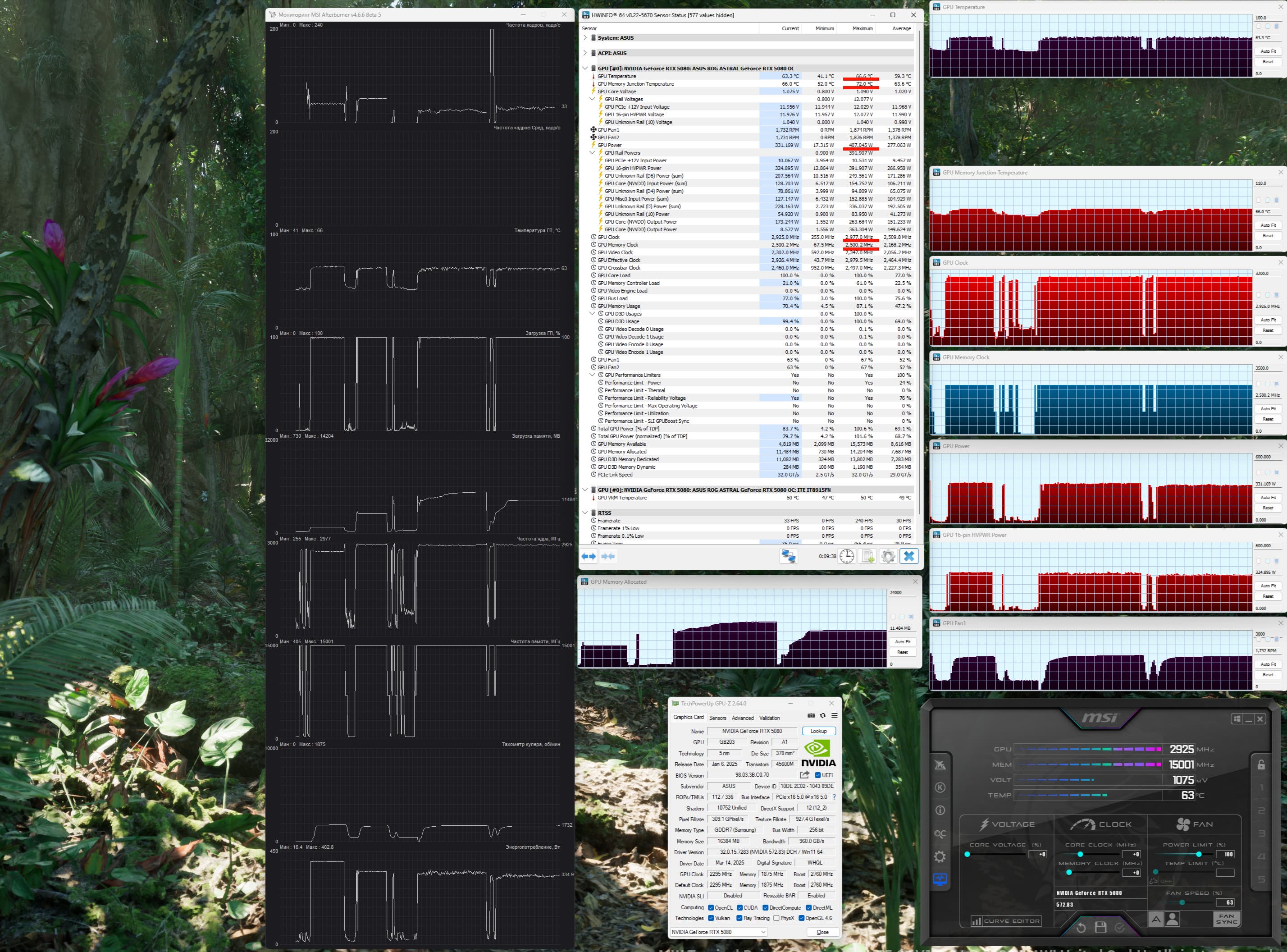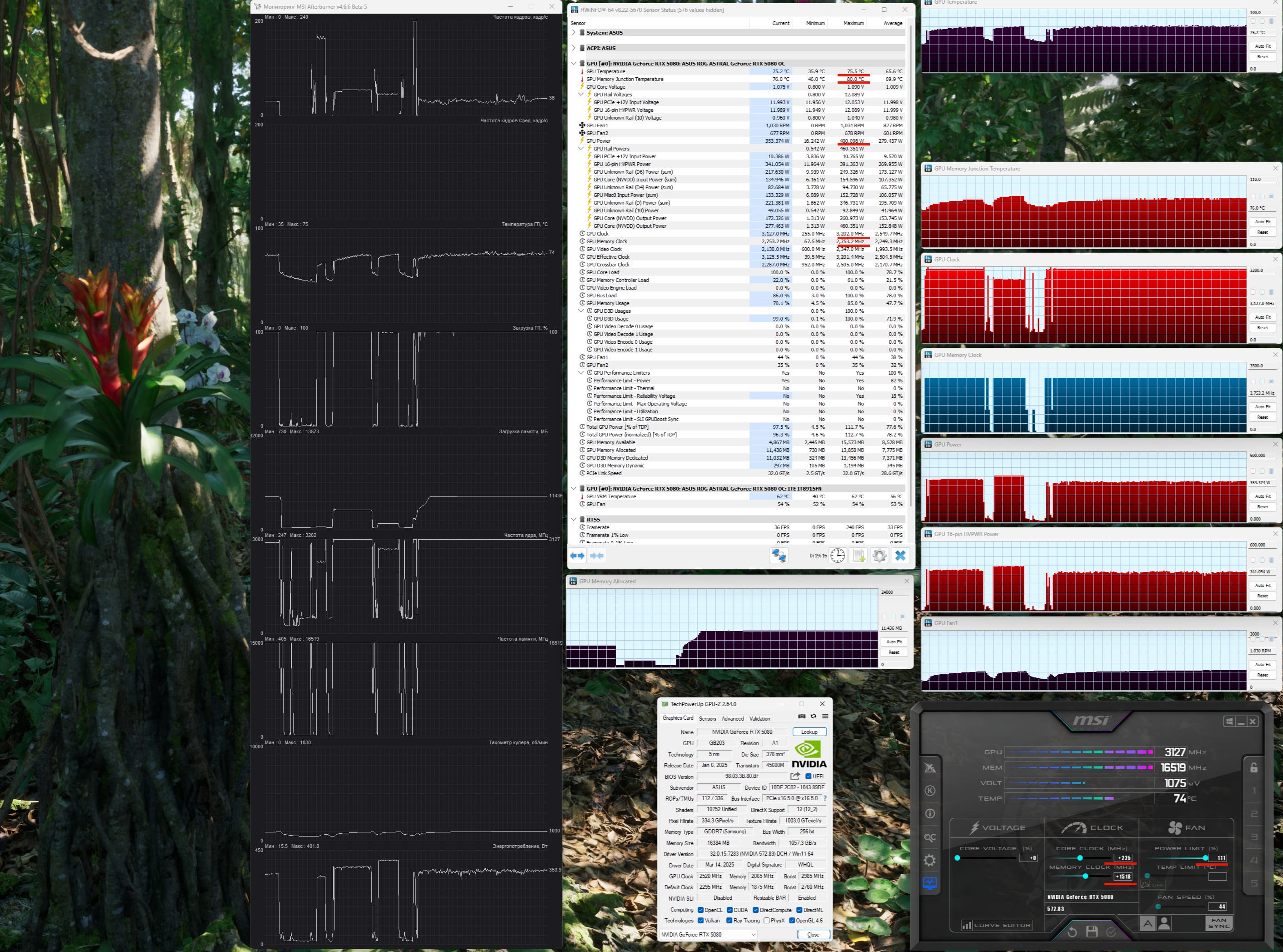 Карта Asus уникальна тем, что изначально имеет повышенный до 400 Вт лимит потребления (штатно у GeForce RTX 5080 — 360 Вт). Это позволяет фабрично установить сильно повышенные частоты работы, которые не будут сбрасываться драйвером, что мы и наблюдали в процессе тестирования. При ручном разгоне лимит можно поднять до 450 Вт, а частота GPU может доходить до 3200 МГц (предполагаю, что для выпуска таких карт специалисты Asus отбирают ядра, способные стабильно работать на подобных частотах). В целом такой разгон может обеспечить до 12% выигрыша в производительности относительно референсного ускорителя.