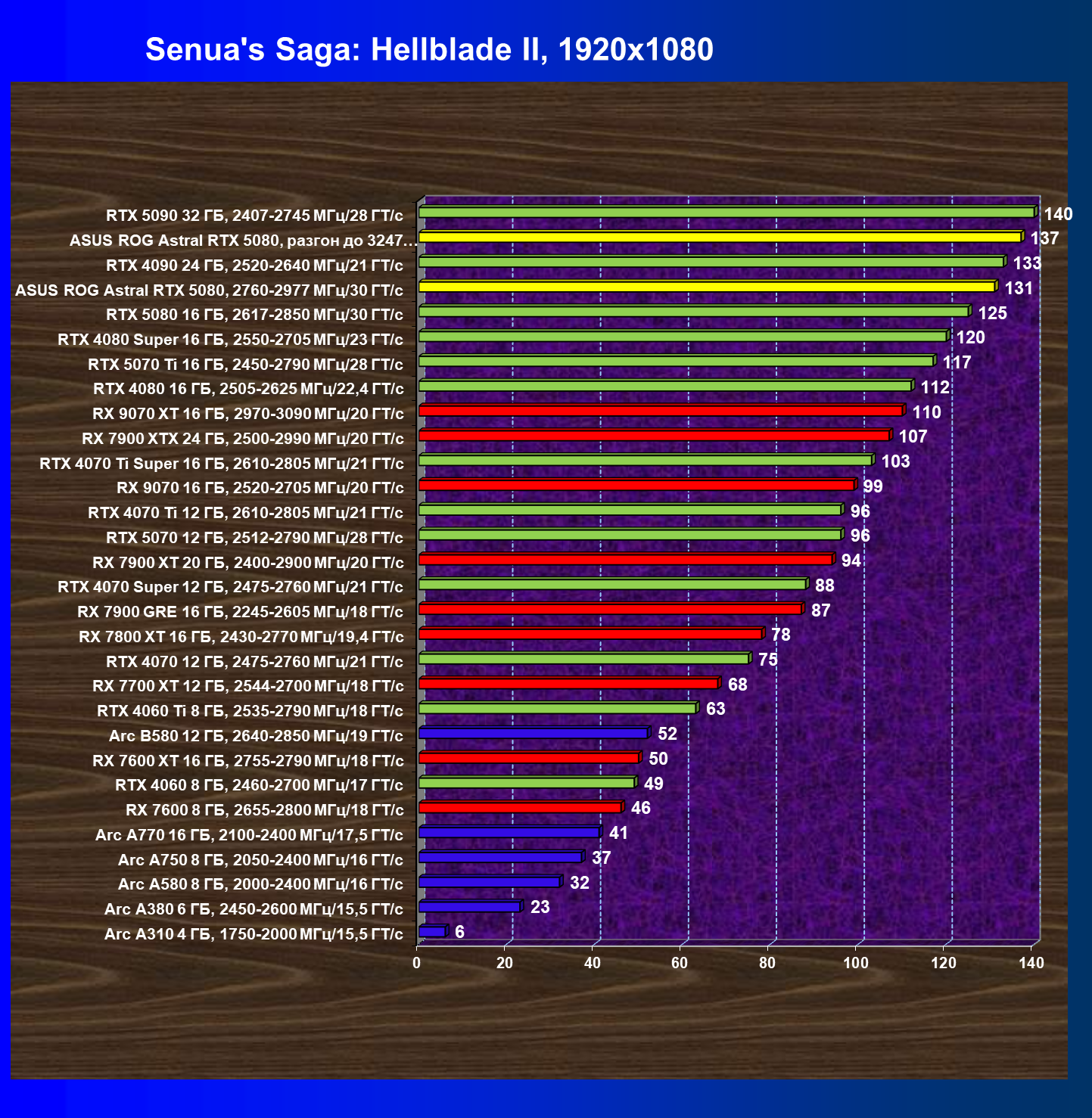 | 21 | RX 7900 XTX 24 ГБ, 2500—2990 МГц/20 ГТ/с | 410 | 4958 | 121 000 |