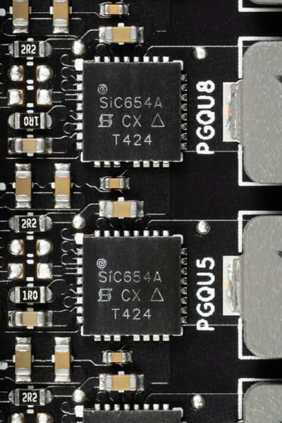 В преобразователе питания ядра и микросхем памяти используются транзисторные сборки DrMOS — SiC654A от Vishay, рассчитанные на 50 А.