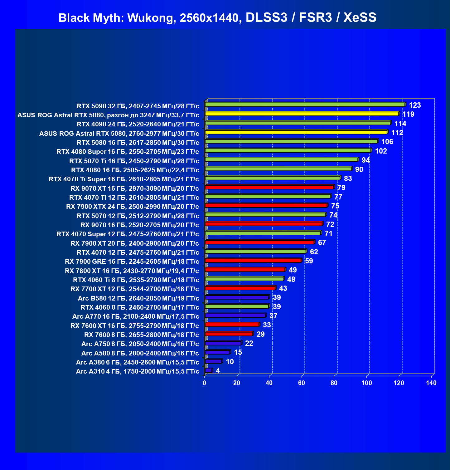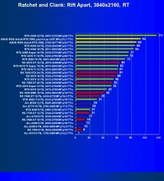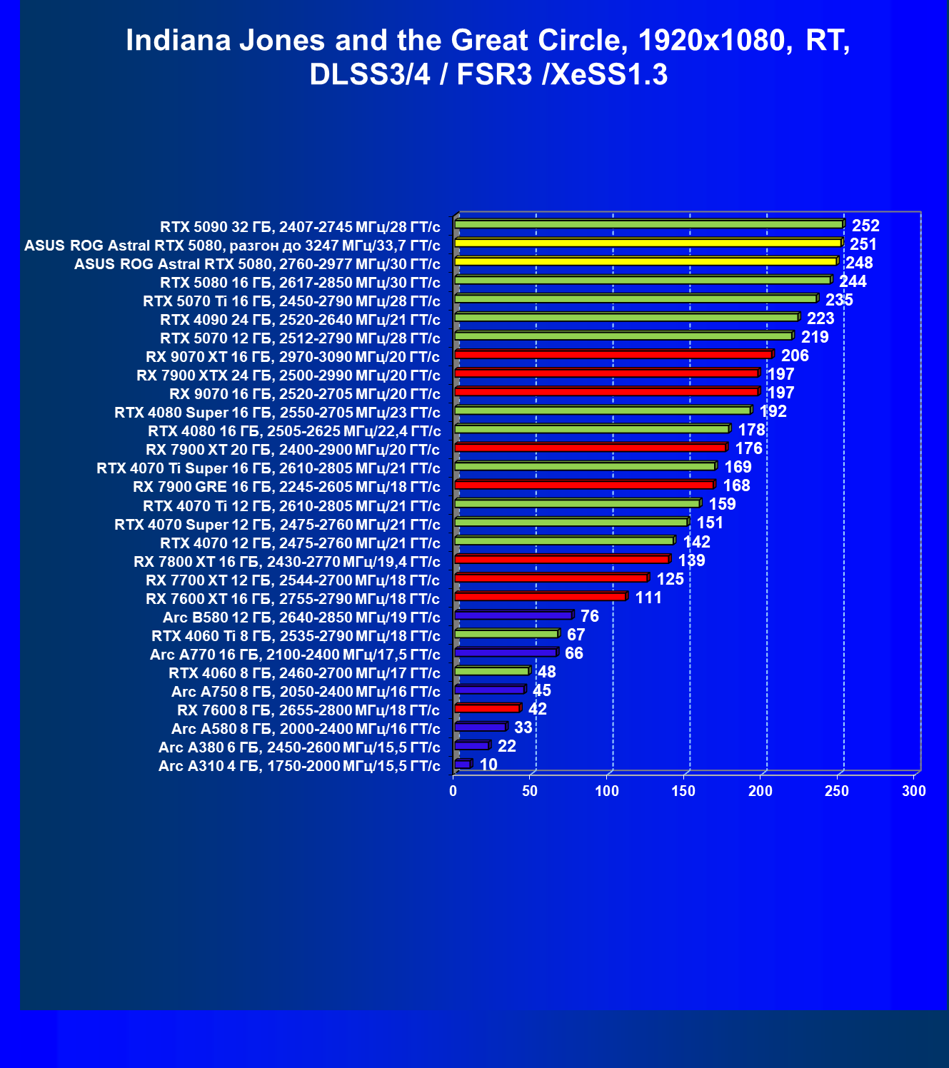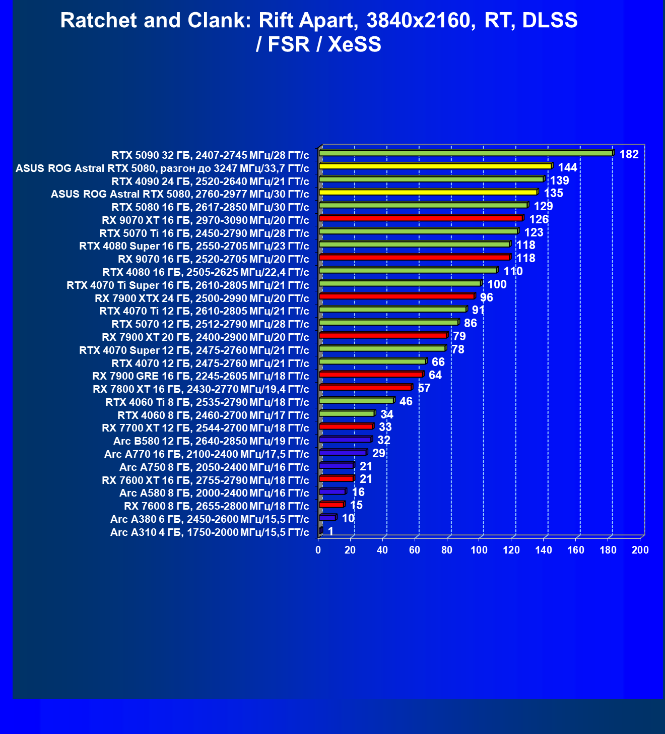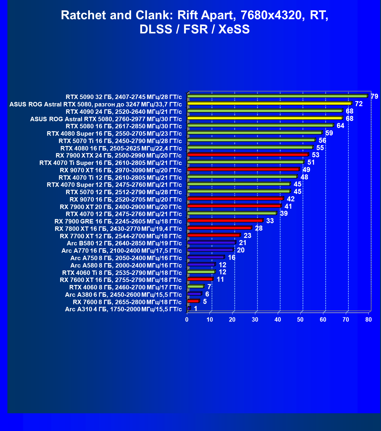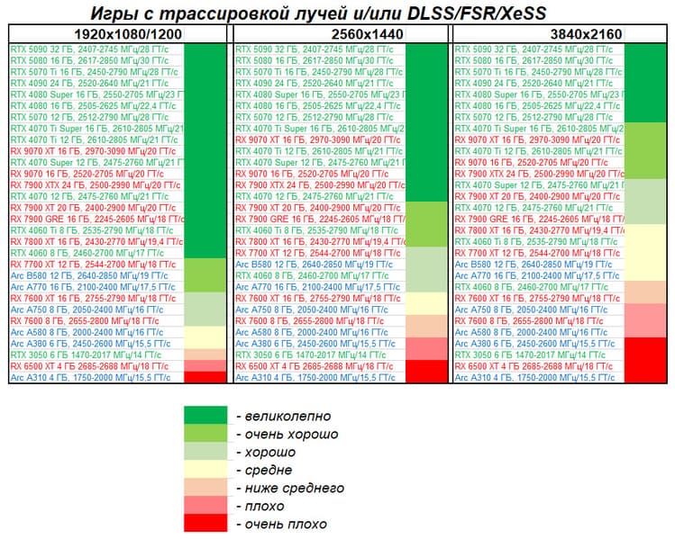 - Результаты тестов со включенной аппаратной трассировкой лучей и/или DLSS/FSR/XeSS в разрешениях 1920×1080, 2560×1440 и 3840×2160