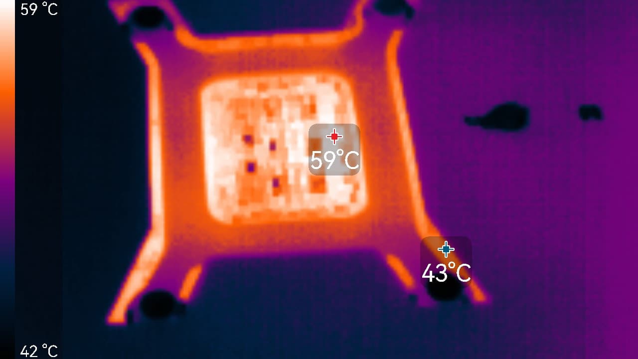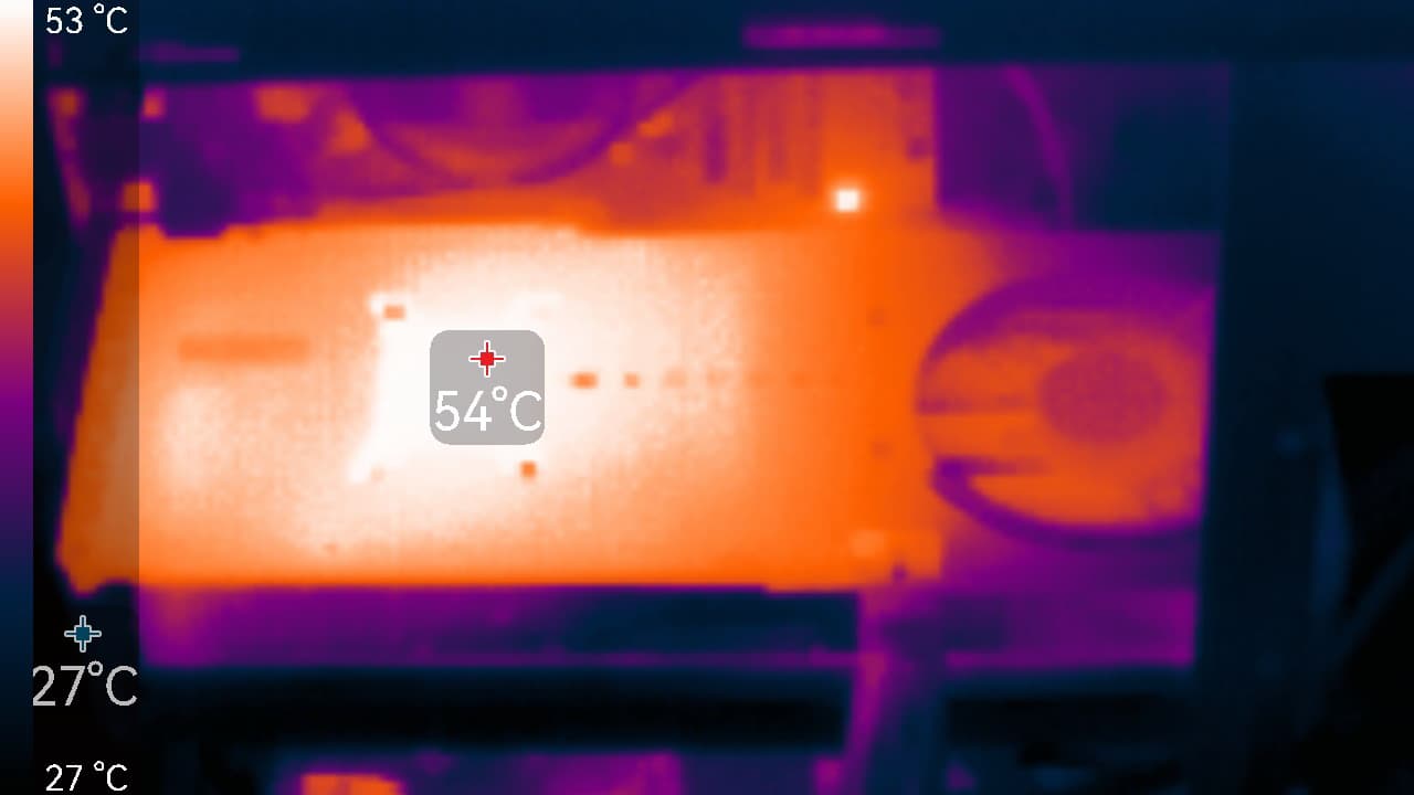 В режиме максимальной нагрузки в 3D температура достигала 66/72 °C (ядро/память). Вентиляторы при этом раскручивались до 1874 оборотов в минуту, шум вырастал до 33,8 дБА: это отчетливо слышно, почти громко.