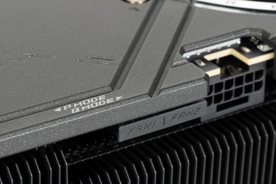 Карта имеет два режима работы, они заложены в двух вариантах BIOS, которые переключаются с помощью переключателя на переднем торце карты: P mode (P — Performance / производительный) и Q mode (Q — Quiet / тихий). Разница между режимами заключается не только в настройке работы вентиляторов, но и в пределах энергопотребления: у BIOS P он может доходить до 400 Вт, у BIOS Q — до 360 Вт (это номинал для RTX 5080). В обоих случаях предел потребления можно поднять вручную на 12% (в случае BIOS P — до 450 (!) Вт).