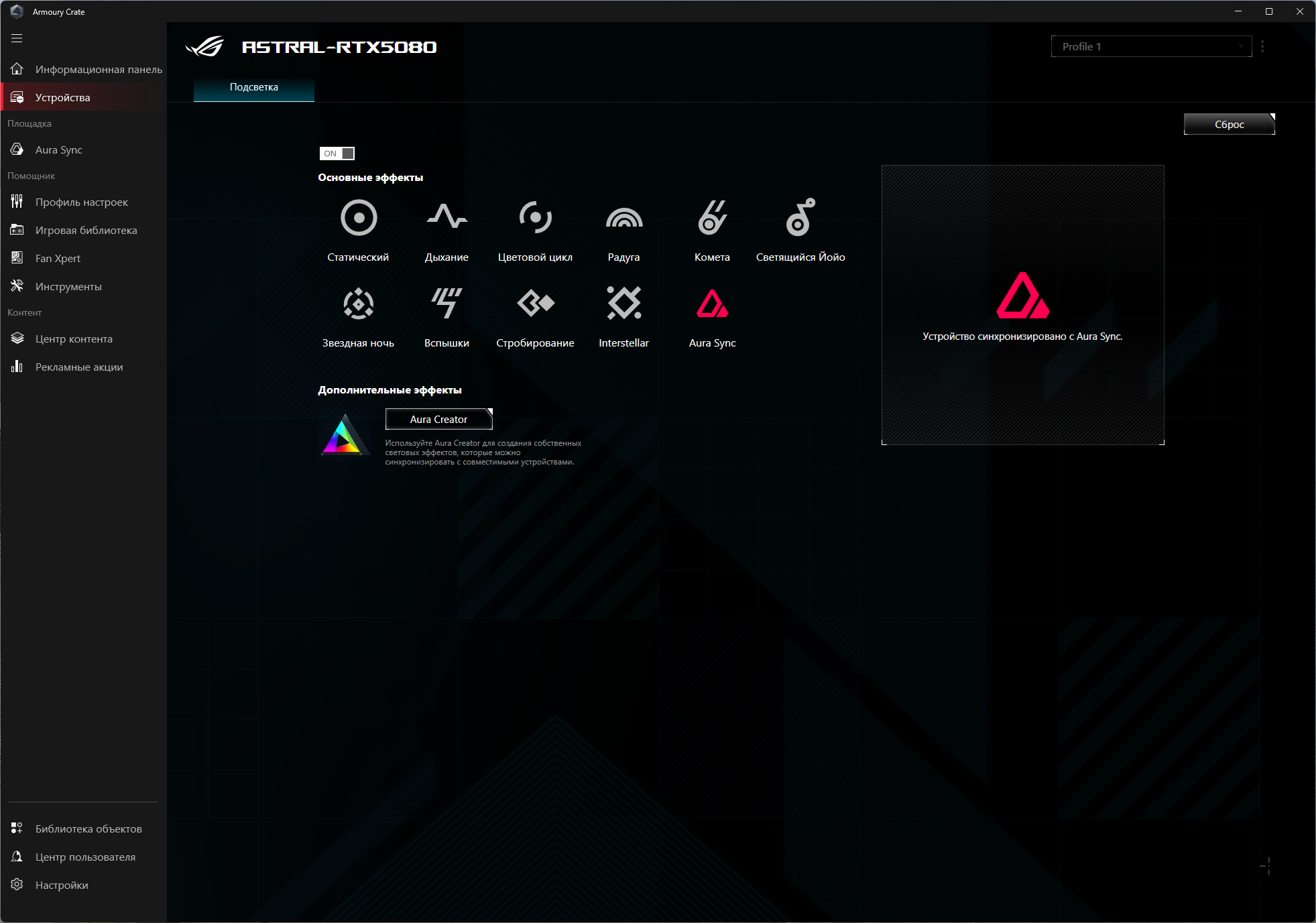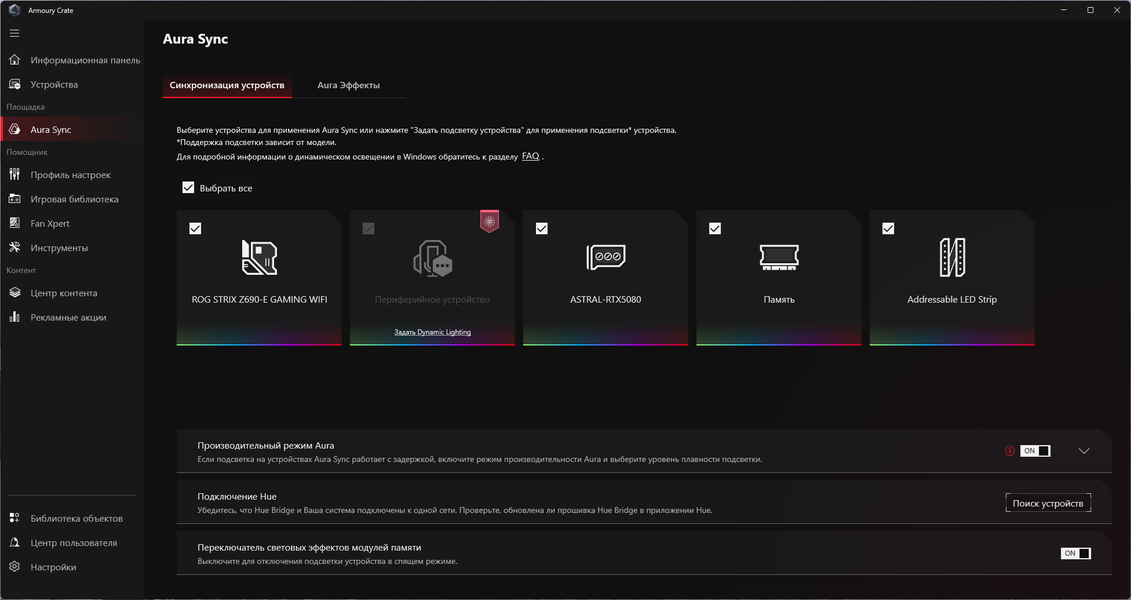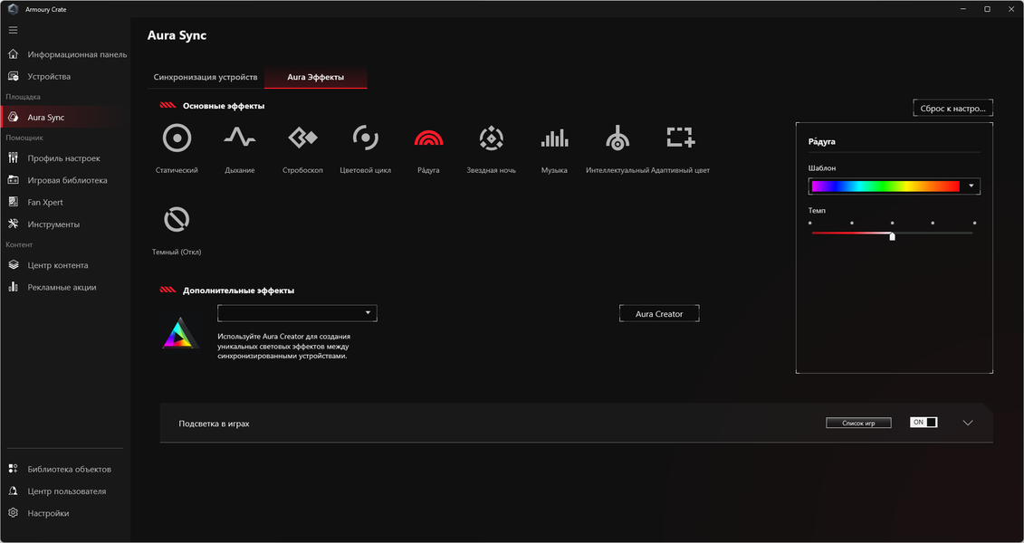 Управление режимами подсветки, в том числе и ее отключением, осуществляется утилитой Asus Armoury Crate. Вариантов сценариев немного, однако имеется программа-компаньон Aura Creator, с помощью которой можно создать свои собственные сценарии подсветки. Подсветка может синхронизироваться с материнскими платами, но только Asus. Этот факт сильно обедняет возможности подсветки.