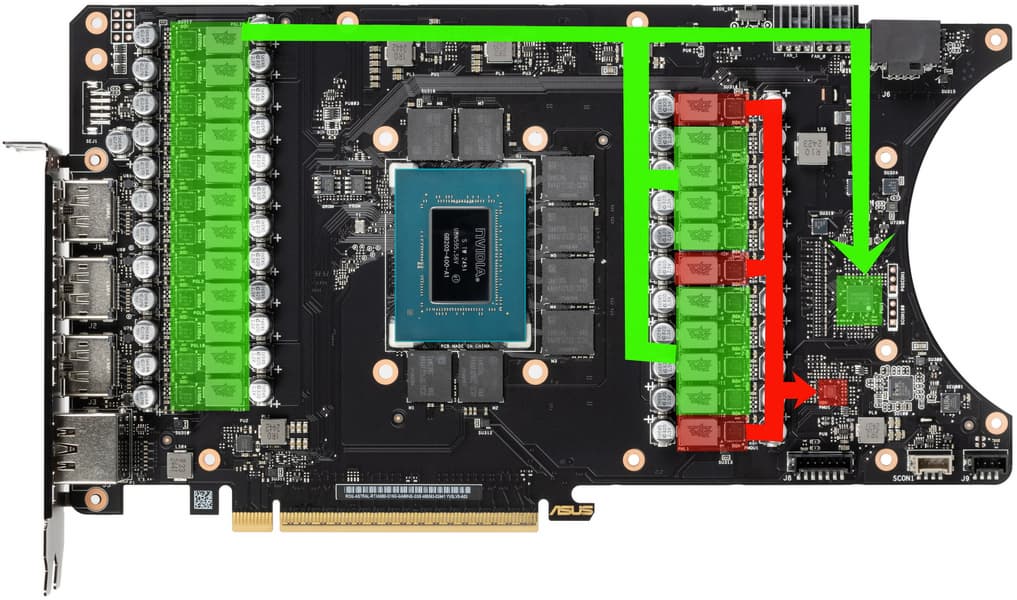 Зеленым цветом отмечена схема питания ядра, красным — памяти. Все ШИМ-контроллеры расположены на лицевой стороне PCB.