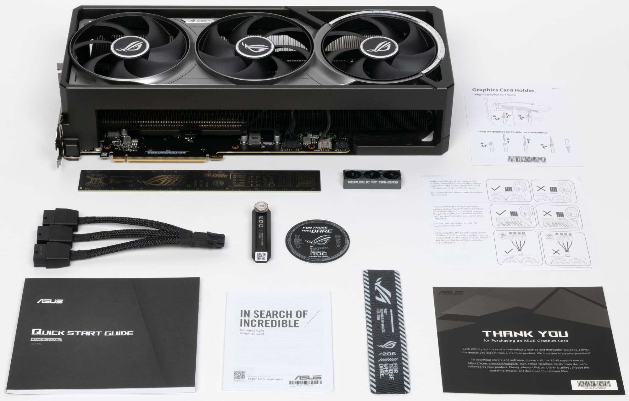 В комплекте поставки кроме карты и адаптера питания имеется еще: раздвижная подставка-отвертка под видеокарту, сувенирные линейка, брелок, keycap, фирменный магнит.