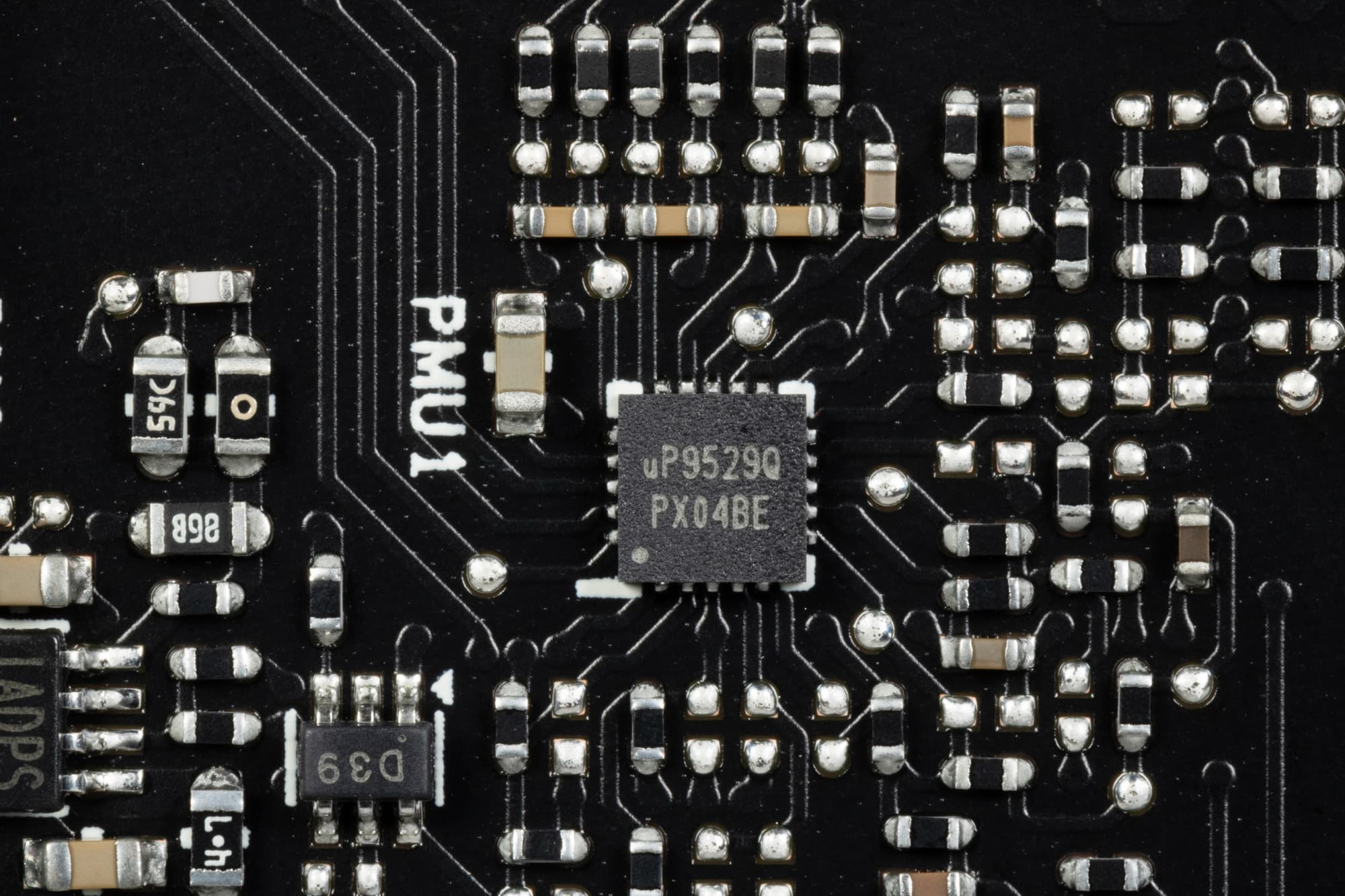 Питанием микросхем памяти управляет ШИМ-контроллер uP9529Q (uPI Semi).