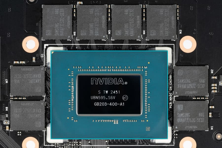 Карта имеет 16 ГБ памяти GDDR7 SDRAM, размещенной в 8 микросхемах по 16 Гбит на лицевой стороне PCB. Микросхемы памяти Samsung (K4VAF325ZC-SC32) рассчитаны на номинальную частоту работы в 2666 МГц (эффективная ПСП 32 Гбит/с).