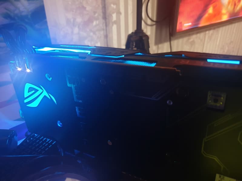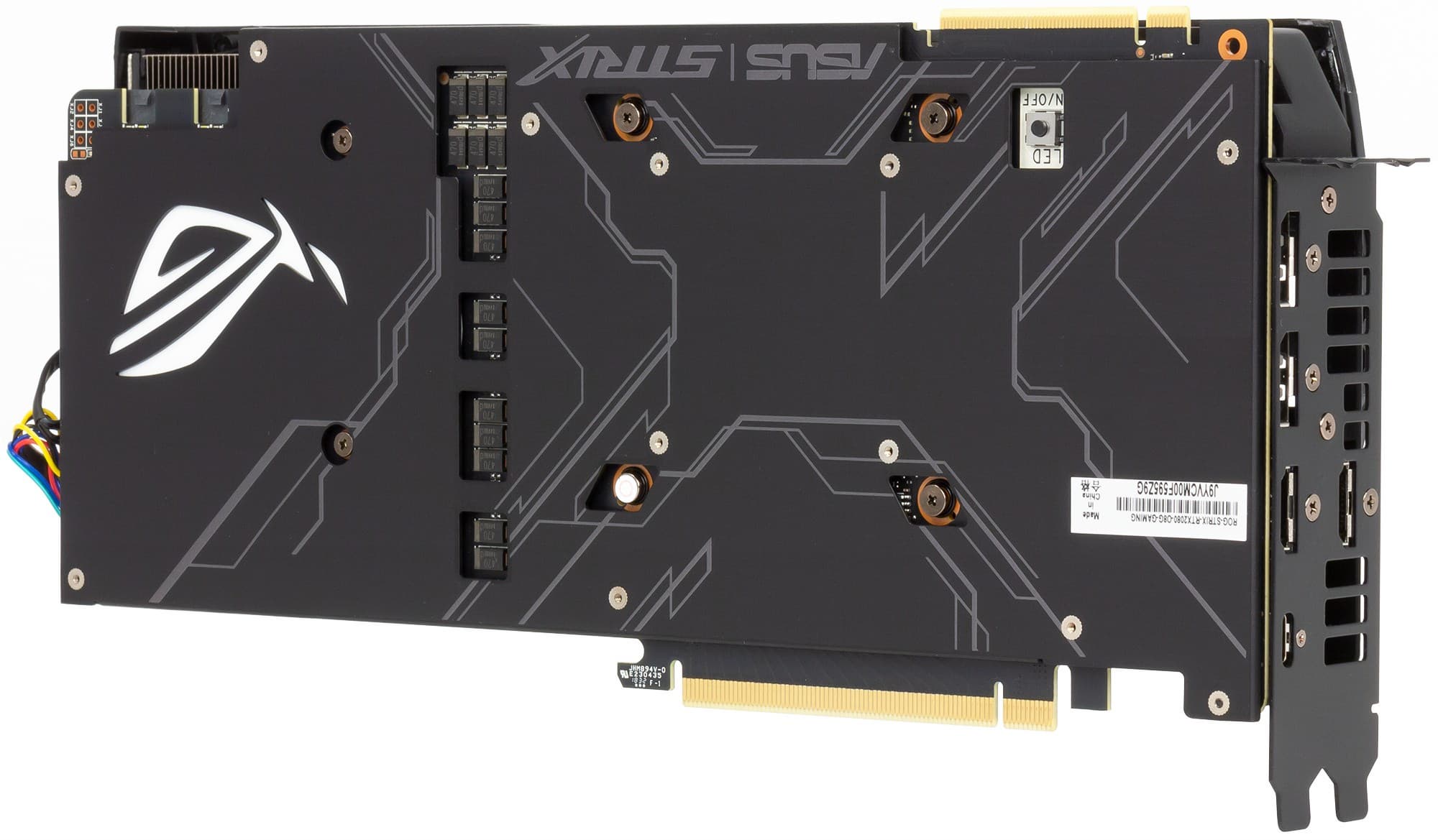 На торце в хвостовой части карты имеются два 4-контактных разъема питания для корпусных вентиляторов. Можно заставить подключенные к ним вентиляторы работать в соответствии с нагревом GPU, увеличивая или уменьшая частоту вращения. На обороте карты есть кнопка включения/выключения подсветки кулера (режим Stealth Ninja). Также управлять подсветкой можно в специальной утилите Asus Aura (об этом ниже).