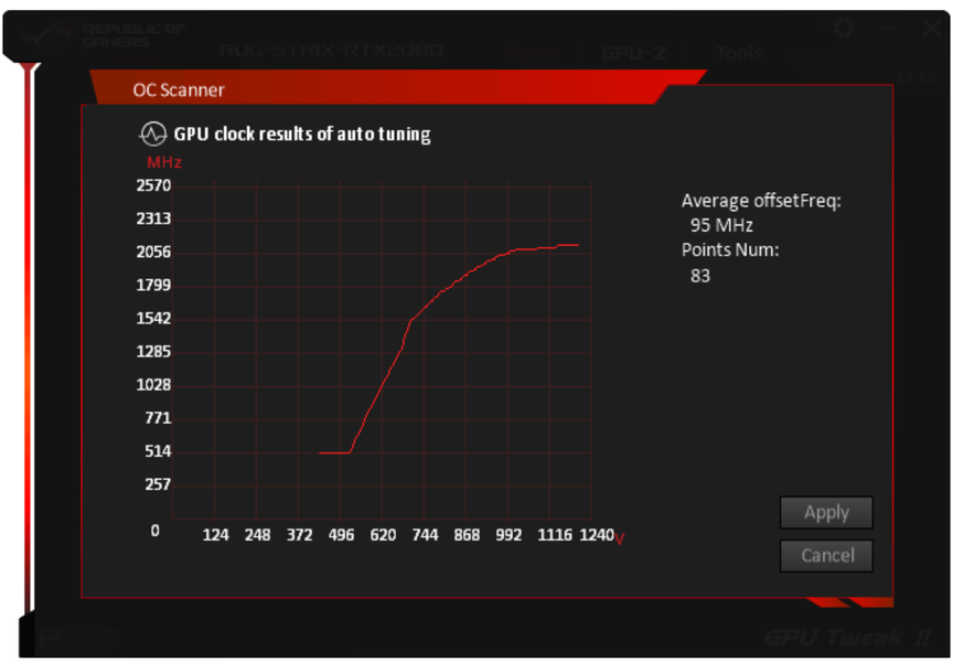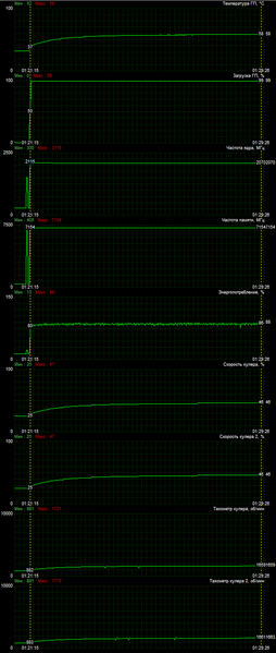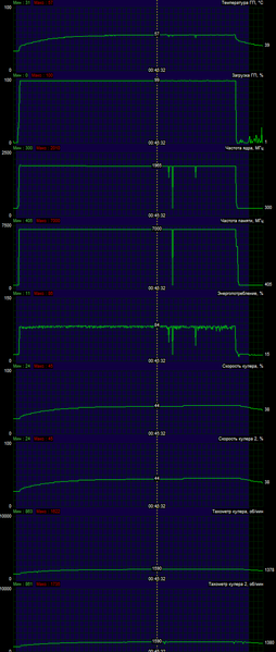 В данном случае GPU нагревался до 62 градусов при том же уровне шума. Карта стабильно отработала несколько часов под нагрузкой на таких частотах. (Маркер на скриншоте мониторинга выше выставлен на максимальную частоту GPU, а не на максимум температуры GPU.)