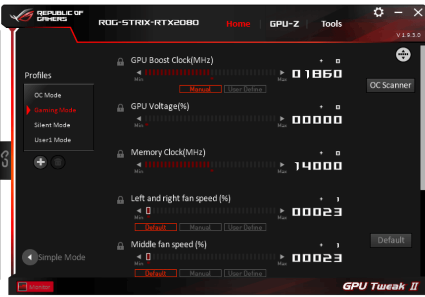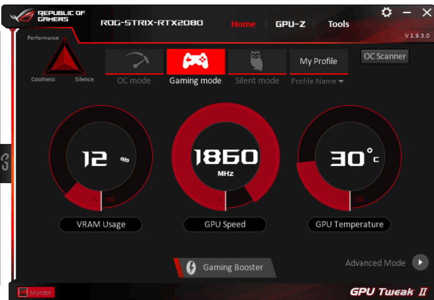 Управление работой карты обеспечивается с помощью фирменной утилиты Asus GPU Tweak II, которую можно скачать с сайта производителя.