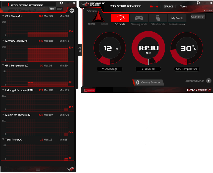 Штатная частота работы ядра в режиме OC mode повышена относительно референсных значений на 8,6%. Однако мы специально привели значения частот у карты Nvidia Founder’s Edition: теперь равняться приходится на показания именно этих вариантов GeForce RTX 2080/2080 Ti, так что не стоит удивляться, когда продукты партнеров Nvidia, выпущенные с повышенными частотами, выдают примерно такую же производительность, как версии Founder’s Edition. Так вот, если сравнивать с Founder’s Edition, то карта Asus имеет частоту работы GPU всего на 3,1% выше.