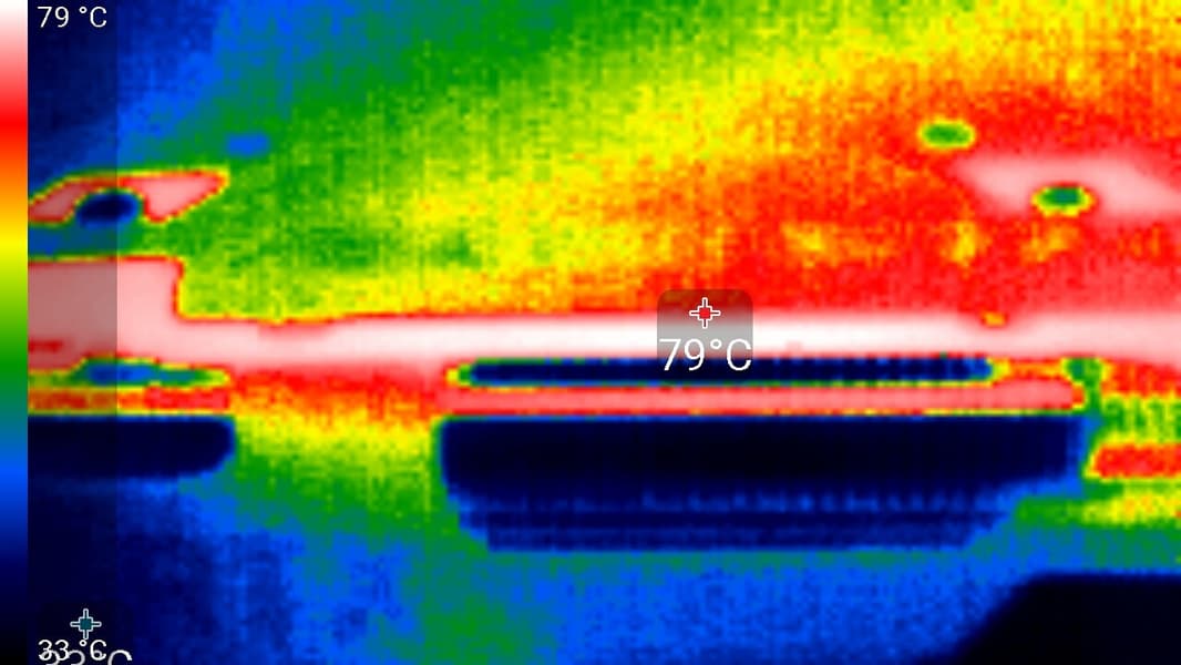 Максимальный нагрев — верхний край оборотной стороны PCB.