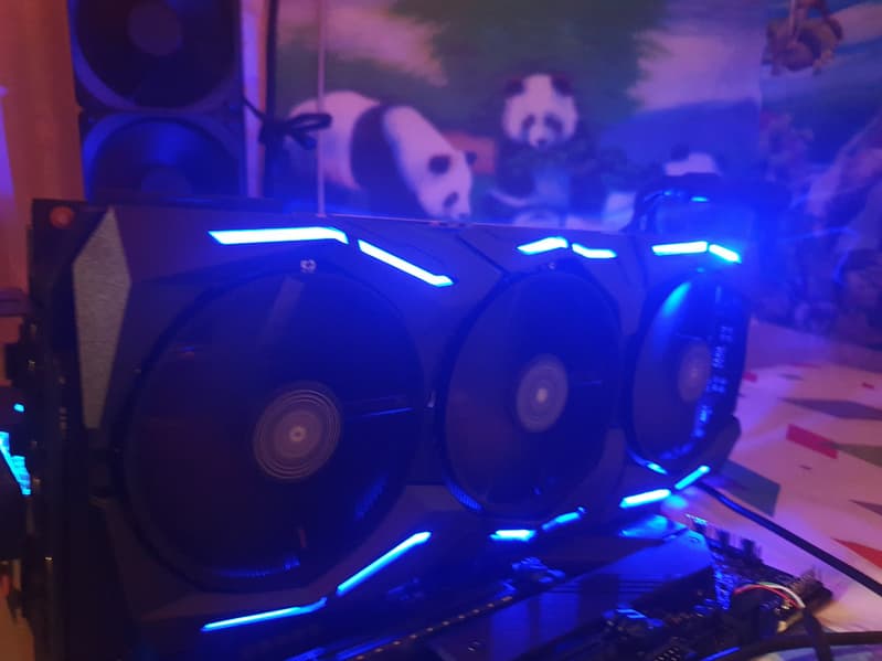 В принципе, относительно той красоты, что мы видели в случае карты MSI GeForce RTX 2080, тут все немного скромнее. Тем не менее, подсветка очень эффектная, а главное, что она есть и на обороте карты — как раз на том участке, который виден через боковое стекло в моддинговых корпусах (мы говорим о традиционном горизонтальном монтаже карты в корпус, когда вентиляторы не видны и напоказ выставлен лишь торец ускорителя). Можно использовать райзер для вертикальной установки карты вне слота материнской платы (если корпус допускает такой вариант), однако в данном случае трудно сказать, что лучше: подсветка «разбросана» по всей карте.