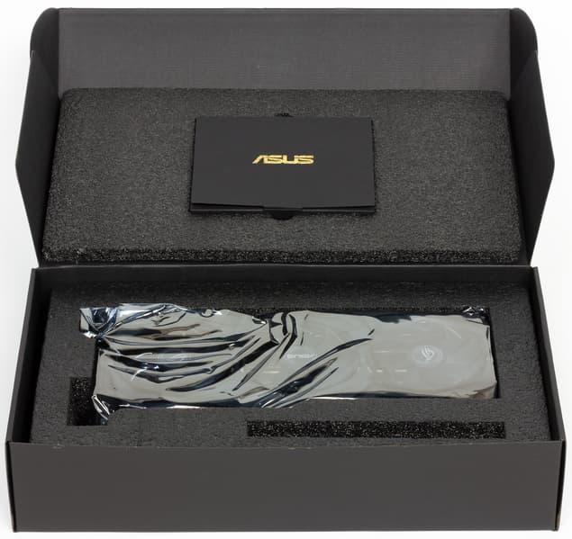 Как во всех СО серии Strix, основным элементом является сдвоенный пластинчатый радиатор, покрытый никелем. Обе части радиатора соединены тепловыми трубками, разносящими тепло по ребрам. Микросхемы памяти охлаждаются специальной пластиной, прикрученной к радиатору, а для силовых элементов имеется подошва с термоинтерфейсом на второй части радиатора. На обороте карты установлена толстая пластина, служащая не только элементом жесткости для массивной карты, но и охладителем PCB; также она несет на себе фирменный подсвеченный логотип ROG.